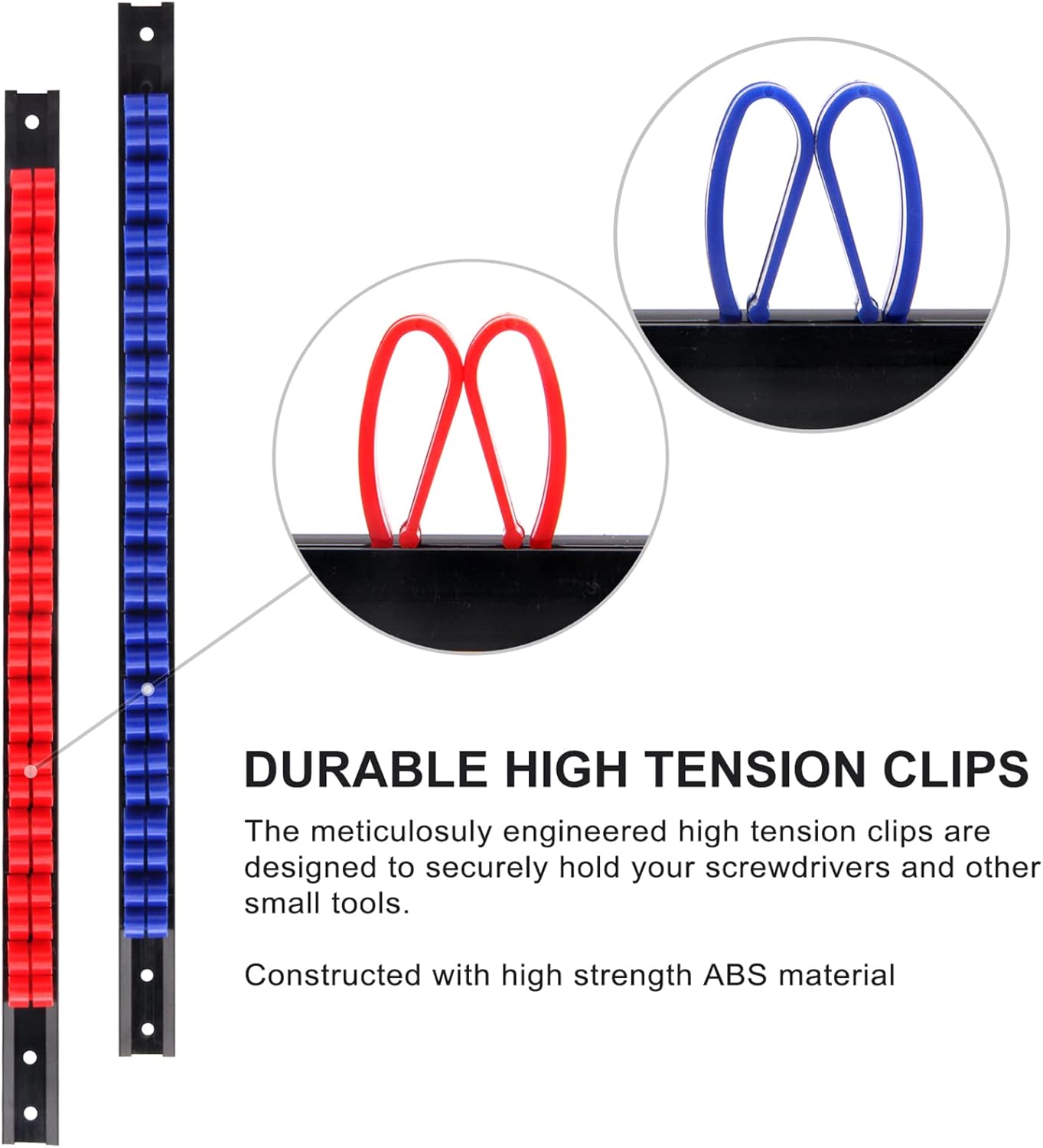 - Set includes 6 pcs screwdriver rails with 13pcs red clips, 13pcs organe clips, 13pcs blue clips and 4 pcs wrench rails with 52pcs black clips