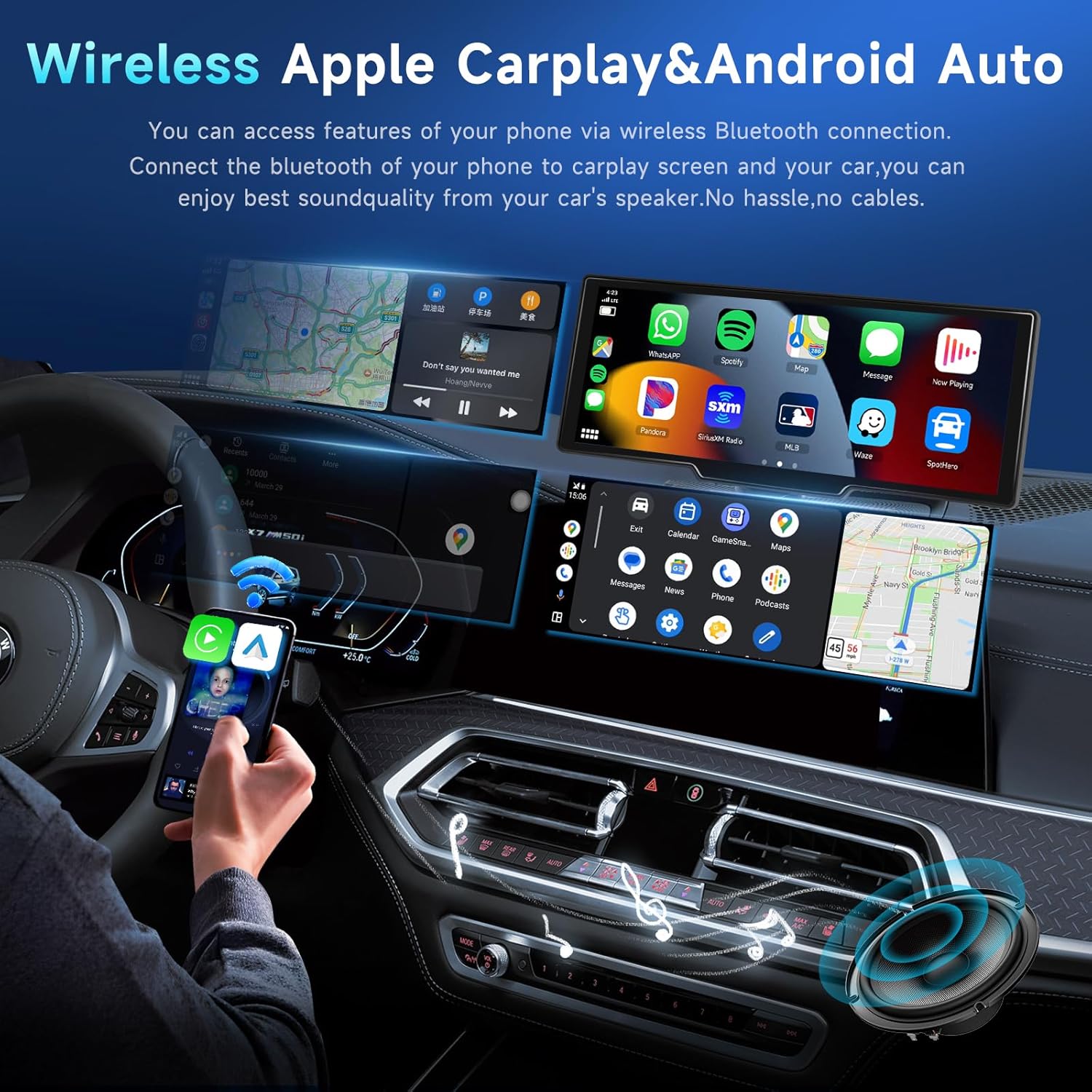 - ๐๐ฉ๐ ๐ซ๐๐๐ ๐๐ฎ๐๐ฅ ๐๐ฅ๐ฎ๐๐ญ๐จ๐จ๐ญ๐ก: This wireless carplay screen with the latest dual Bluetooth technology, connect your phone via Bluetooth to use wireless CarPlay and Android Auto on the portable car stereo. At the same time, pair your phone to the original car Bluetooth to play audio over the car speakers directly