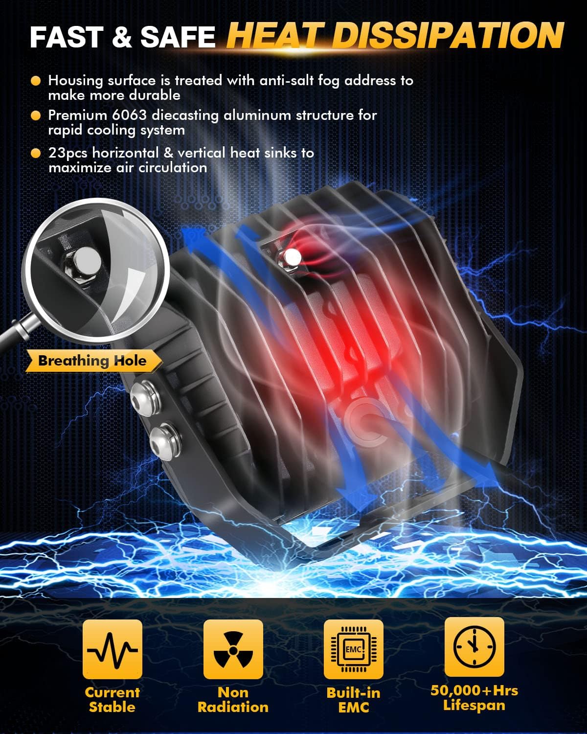 - 【500% Brighter】White, yellow, amber tri-color choice. Matched with dual LED types to ensure brighter and more uniform light output. Combination of spot flood beam for longer and wider illumination range, allowing you to overcome any weather and road conditions.
