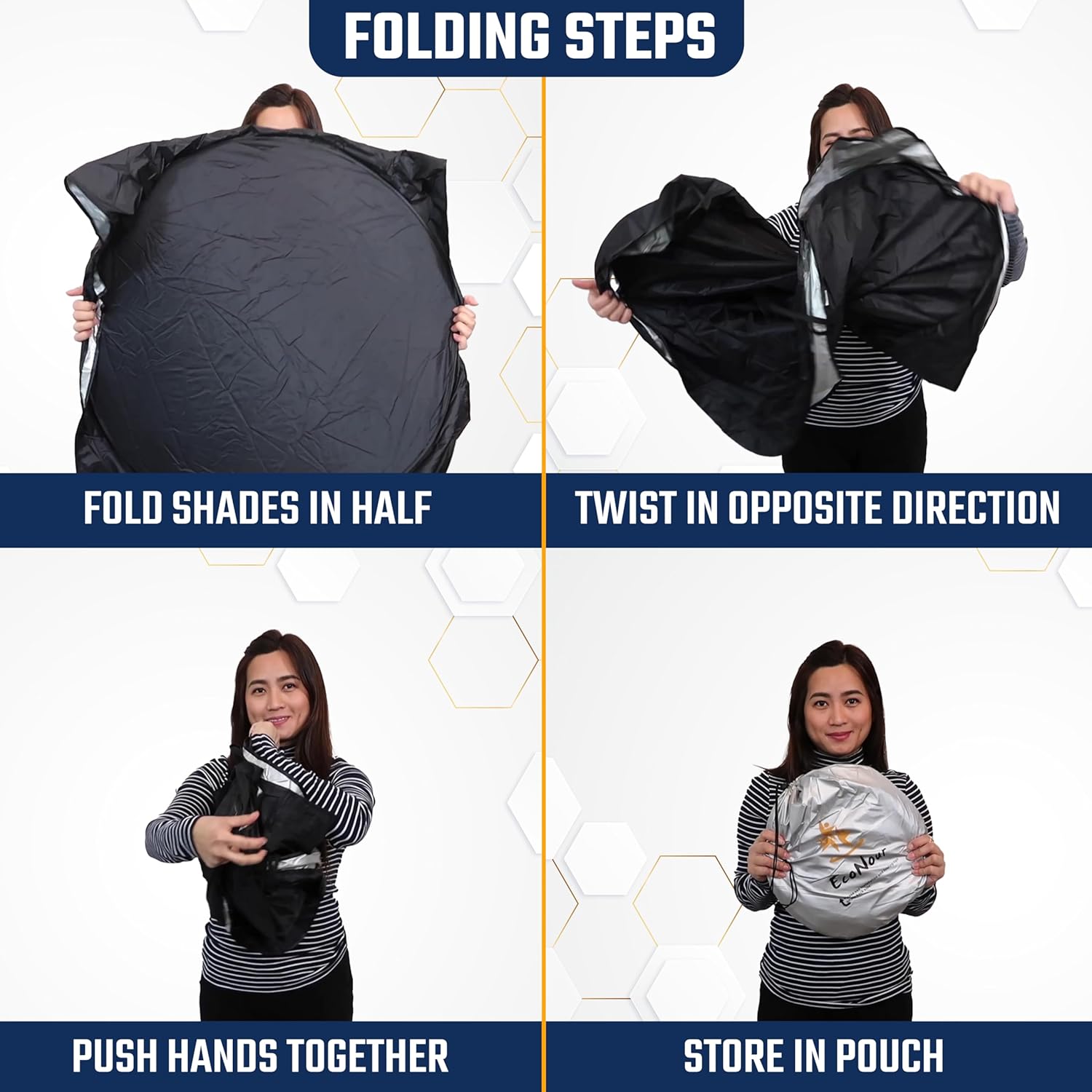 - Compact Car Sunshade for Daily Use: This foldable car sun shade fits easily into a pouch for quick storage. Keep your car window shades handy in your glove box or side door for on-the-go sun protection.