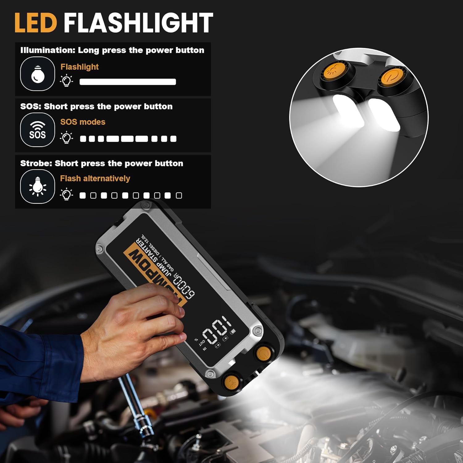- [ 3 Modes of LED Lights ] - The car battery charger jump starter has a built-in high-brightness LED light, which is super bright and has 3 modes, including flashlight, flash and SOS, which can help you in emergency situations