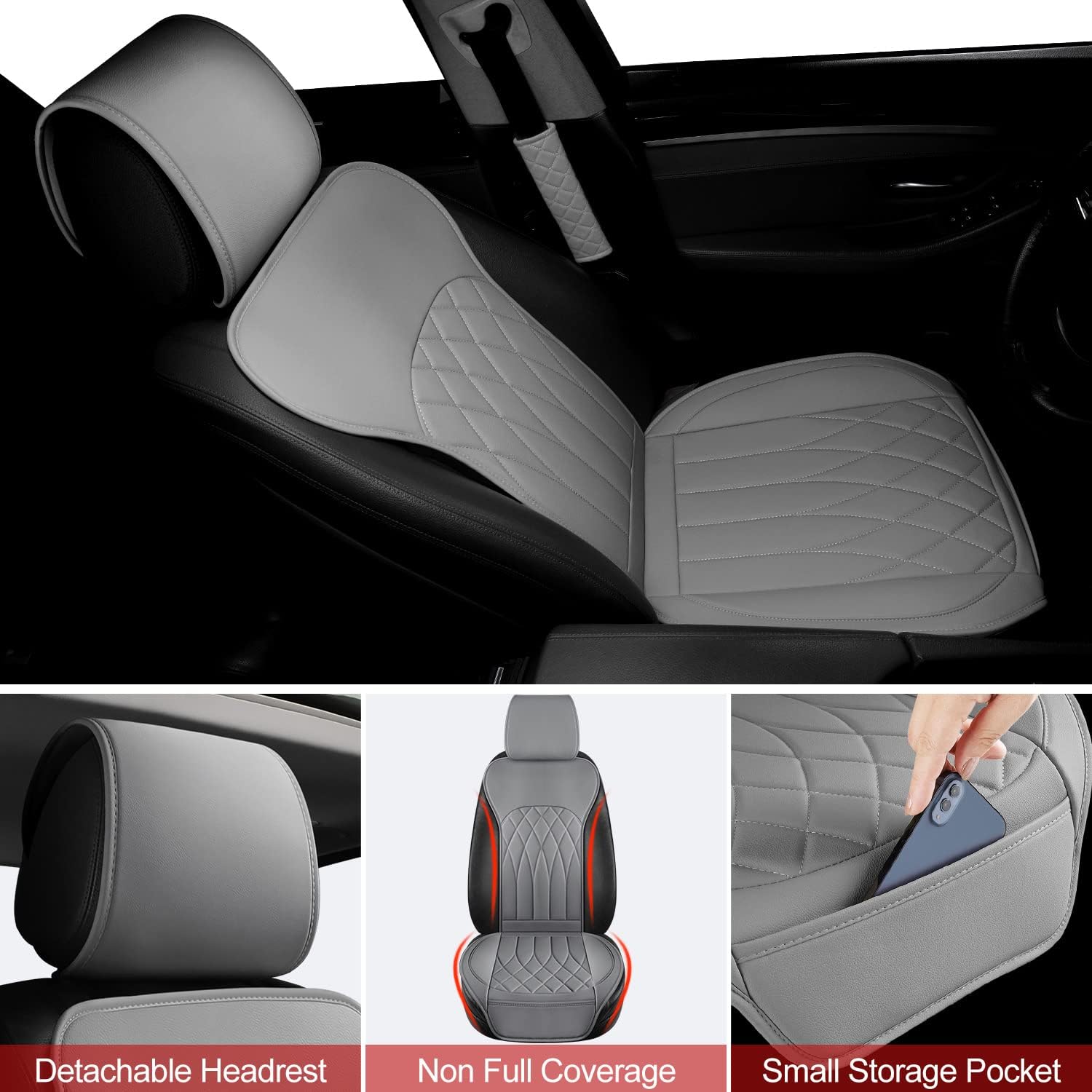 - Anti-slip & Storage Pocket: Bottom pad is designed with anti-slip rubber, this front leather seat cover will stay pretty well in place. Durable chucks and hooks also secure seat covers. Storage Pockets are designed conveniently and fast. You can quickly grab what you need, such as your phone and wallet, from the front storage pocket of your Leather car seat cover.