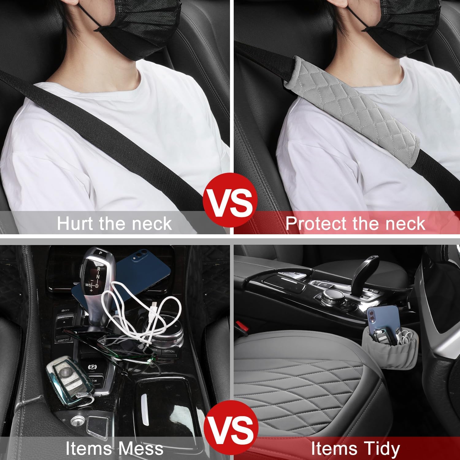 - Universal Size & Extra Accessories: Car seat covers are suitable for most cars. The car pocket organizer is compact and can be attached anywhere. It is perfect for storing small items such as phones, glasses, keys, change, and data cables. Seat belt covers, soft and comfortable, make your driving experience very comfortable, perfect for cars, trucks, backpacks, luggage shoulder straps, etc.