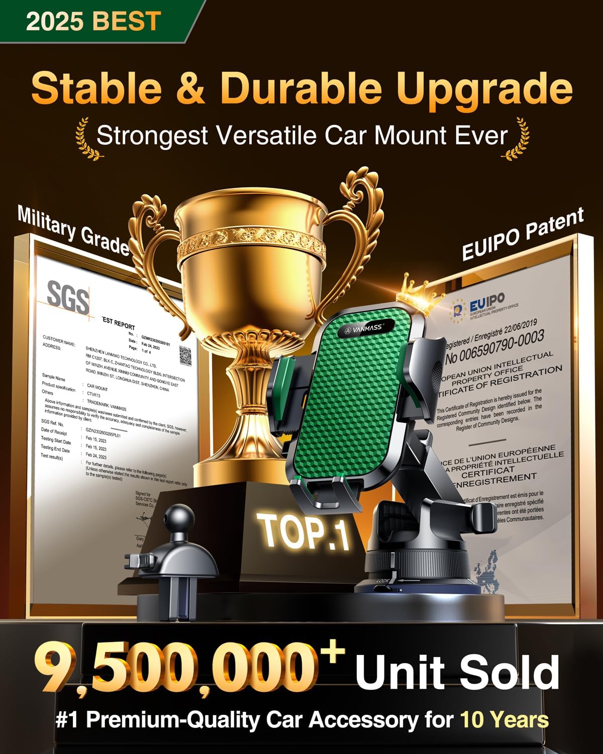 - 【Pro Version:VANMASS's Best Choice】VANMASS has been dedicated to car phone holder for 8 years, always leading the car holder industry in all aspects: safety, stability, durability, compatibility, multi-scene adaptability,climate friendly. The pro version mount enables the cutting-edge design team to create the best choice for customers- highest rating, most customers' preference, EU Intellectual Property Patent (No.007708805-0001), Military Grade Cert (No.GZMR220601855501), CP65/REACH/ROHS