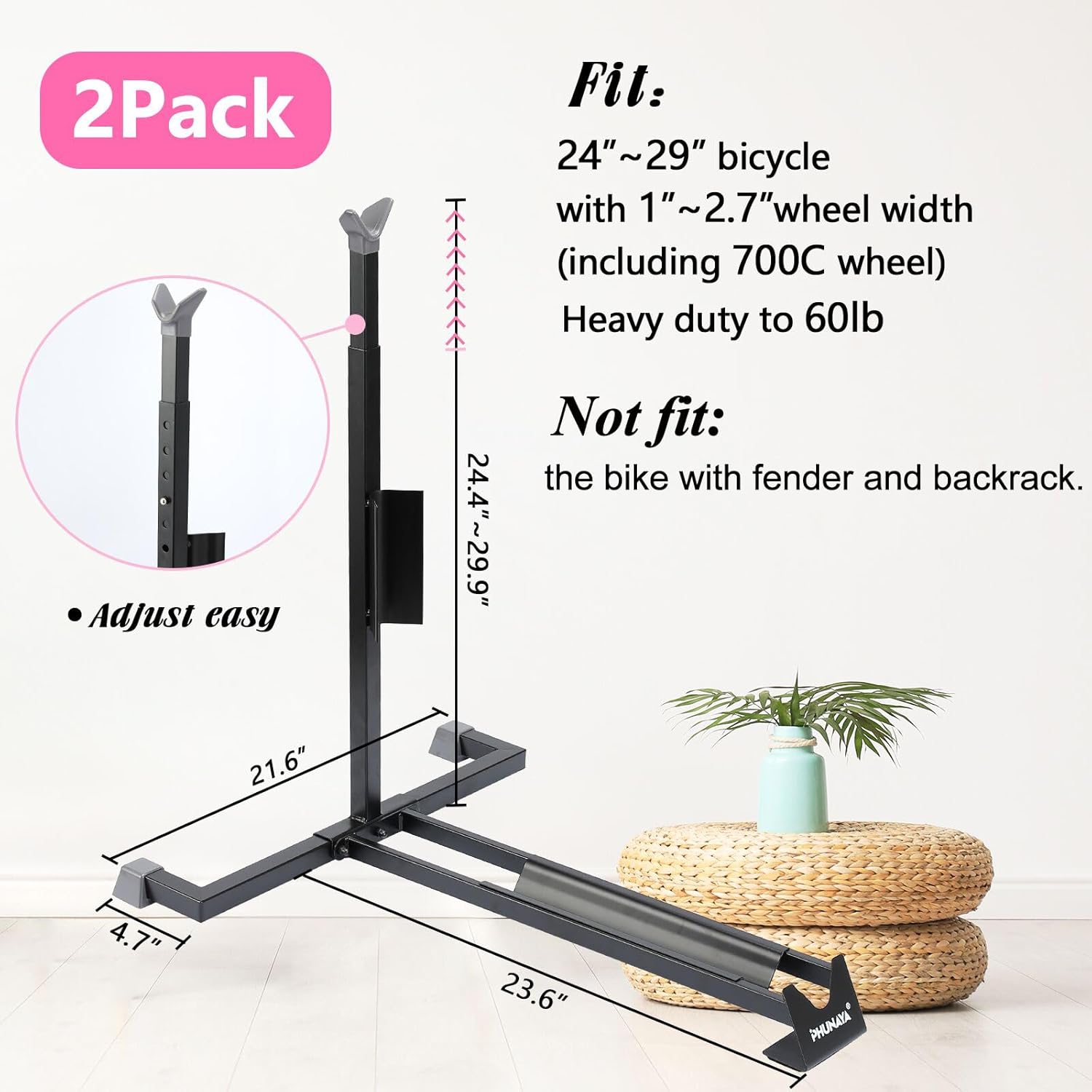- 【Easy to Use】No need punch or mount,the upright bike stand will standing on your floor without any wobbly risk.With gift wheel fixing band to hold the front wheel in place,even a kids can store the bicycle easy.The vertical bike rack is not suit the bike with fender and backrack.