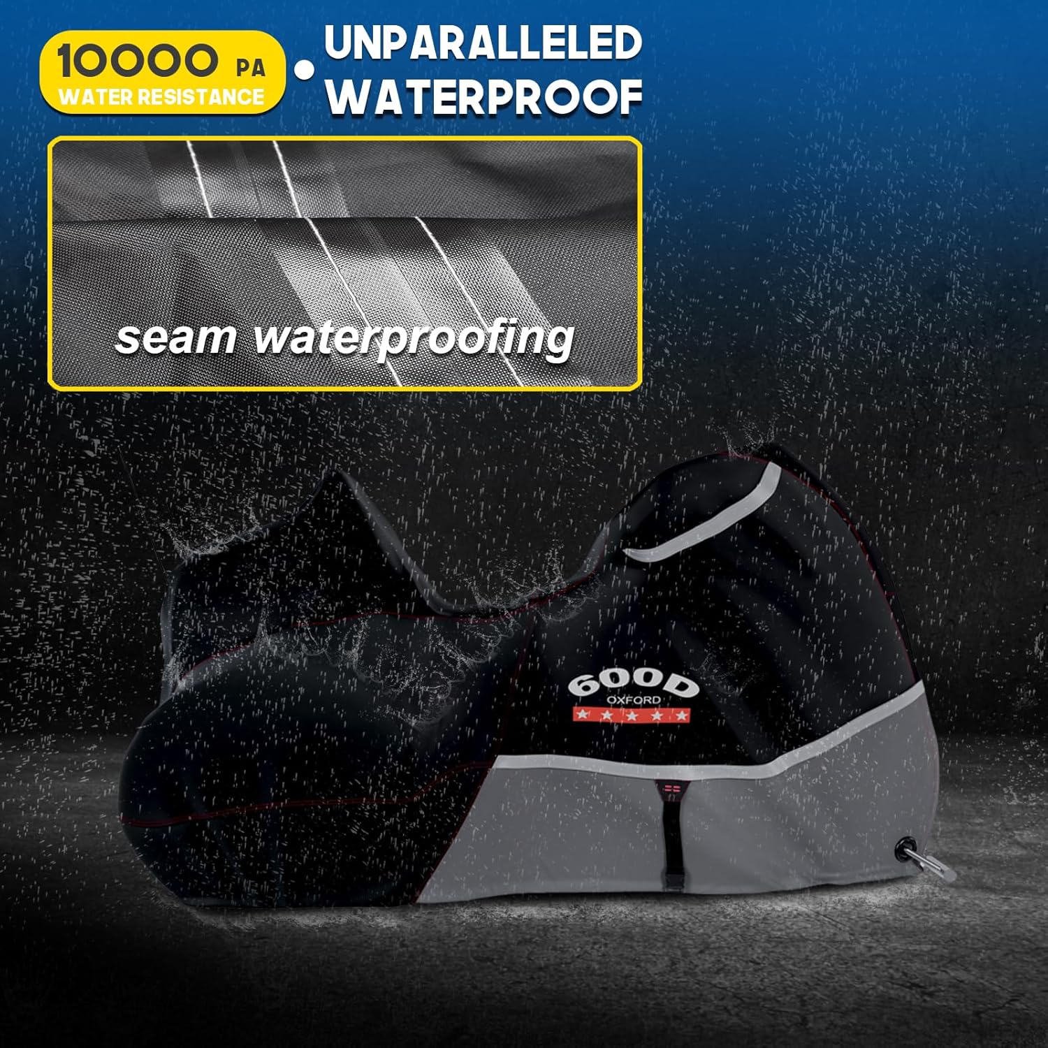 - 🛵【Waterproof and Windproof】:The material used in motorcycle cover is 600D multi-layer Oxford cloth, with the seam applied with glue,so it is rainstorm-proof. Adjustable Hem Cord at the lower hem of the cover can press the cover against the bike body closely. In addition, there is a buckle at the bottom to prevent the cover from being blown away.