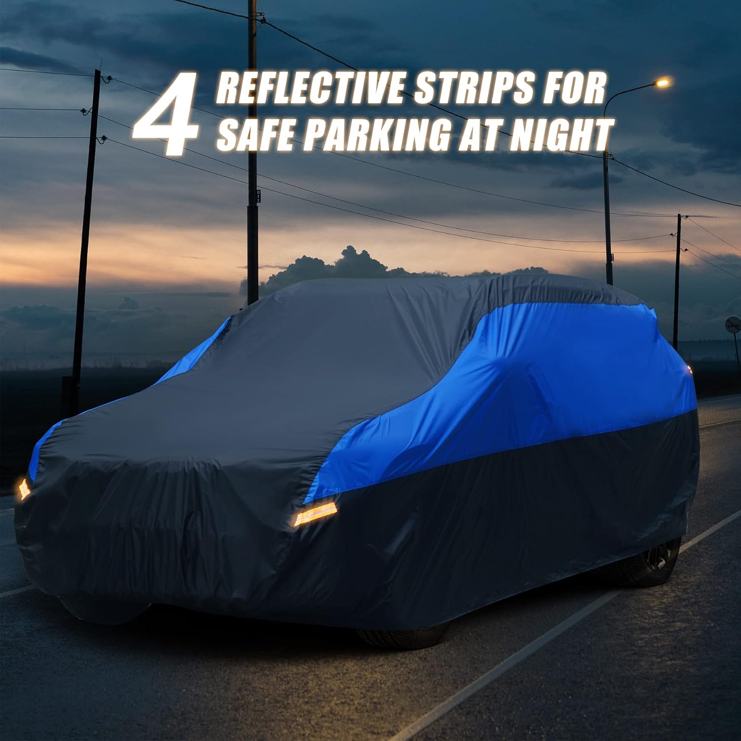 - ăPowerful Functionsă1> 4Pcs reflective stripes remind other people in the night, avoid accident in dark environment 2> The elastic hem at the bottom makes the car cover fit the car better 3> Windproof straps can prevent the cover from being blown away by the heavy wind 4> Double stitch technology which makes the fabric stitched tighter&non-tearable, more durable than other similar covers.