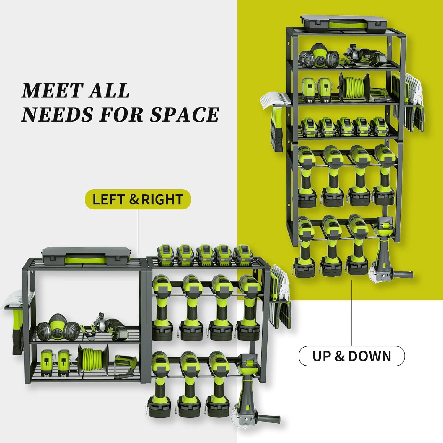 - HIGH CAPACITY: The KAFAHOM power tool organizer has 2 downside racks that can hang up to 8 power tools - 20Vs, 60Vs, and 66Vs. Plus 4 extra upper layers for accessories of those power tools like battery holders, batteries, drill bits, rotary tools, nail units, etc. The tool organization and storage also comes with 9 holes for screwdriver storage ,7 for pliers. The entire body is made of cold-rolled carbon steel for excellent durability and a load capacity of over 180 lbs (max).