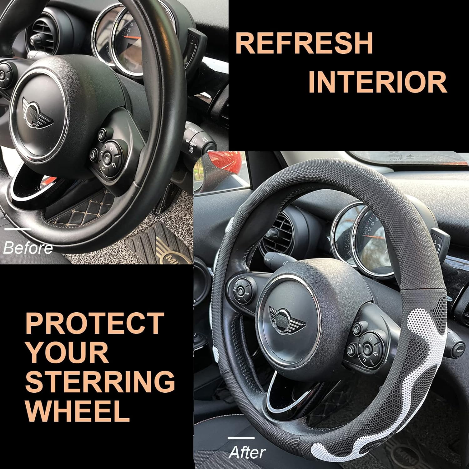 - Built to Last: Crafted with a solid rubber inner circle, textured microleather leather, and a 3D honeycomb silicone grip, this cover boasts a unique material combination that ensures exceptional durability. The silicone grip effectively relieving sweaty hands under hot weather. Enjoy a long-lasting and comfortable grip with PINCTROT car steering wheel cover.
