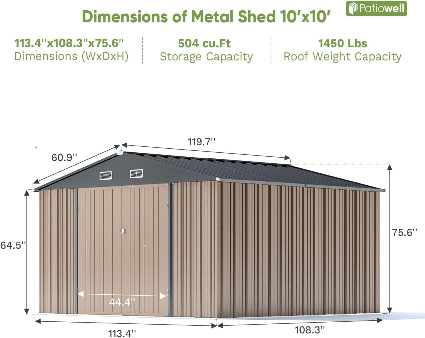 Patiowell 10 x 10 FT Outdoor Storage Shed,Metal Yard Shed with Design of Lockable Doors, Utility and Tool Storage for Garden, Patio, Backyard, Outside use,Brown