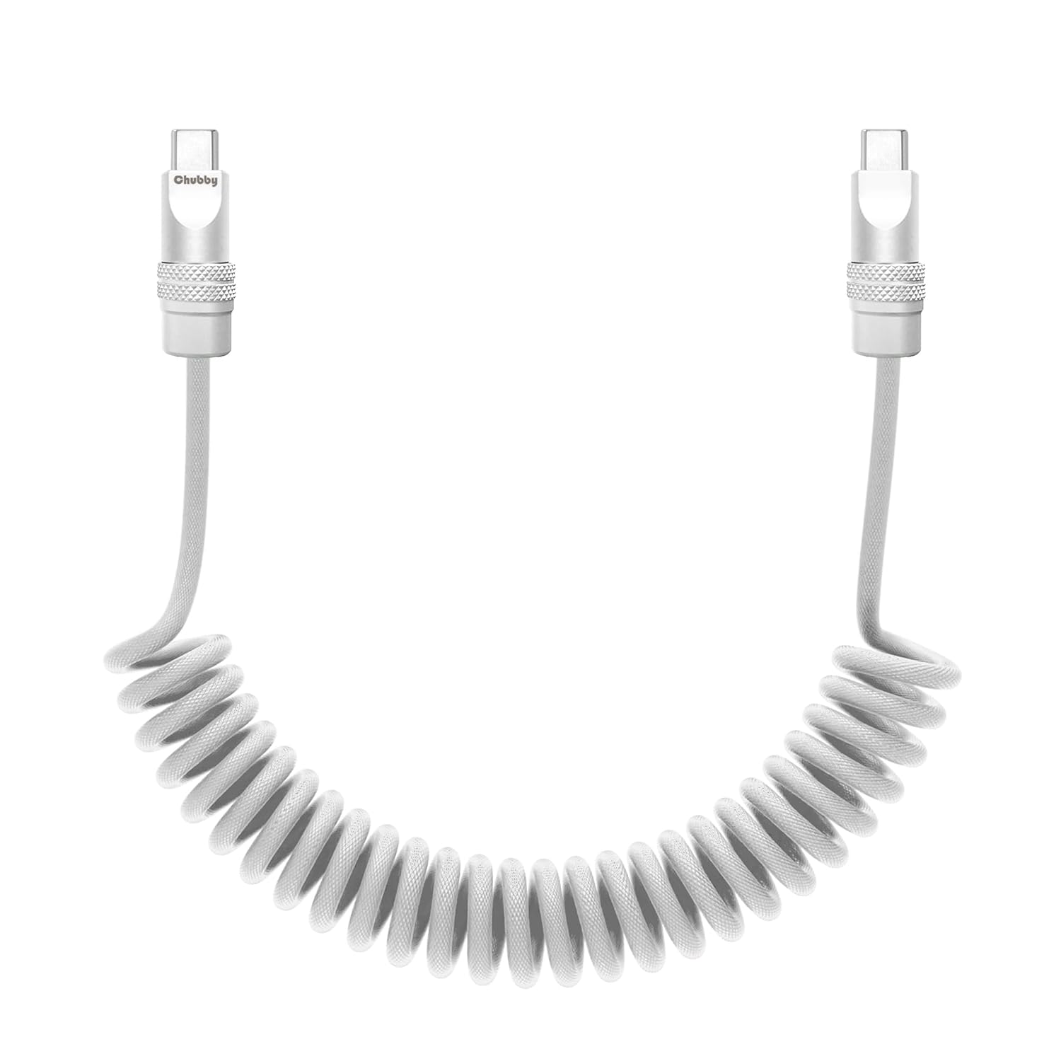 chubbycable Curly Chubby - Retractable Fast Charging Cable 240W Coiled Charger Cord for Car Durable USB-C Cable for Phones, Tablets and More, White, Type-C to Type-C, 1.3FT-2.3FT