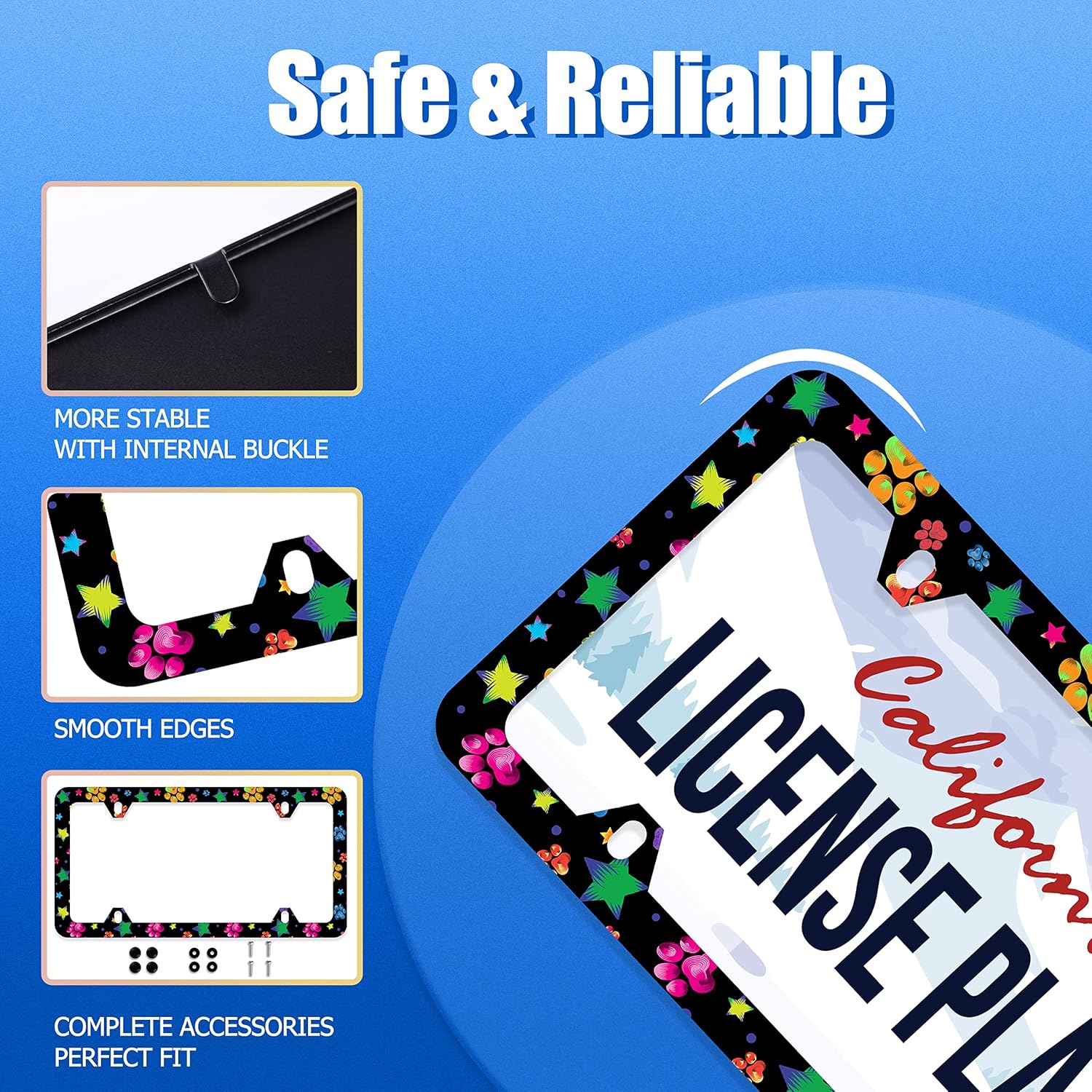 Colorful Animal Paw and Star License Plate Frame Colorful License Plate Stainless Steel Parts Funny License Plate Decorative with Screws Size 12.3" x 6.3" for Men Women