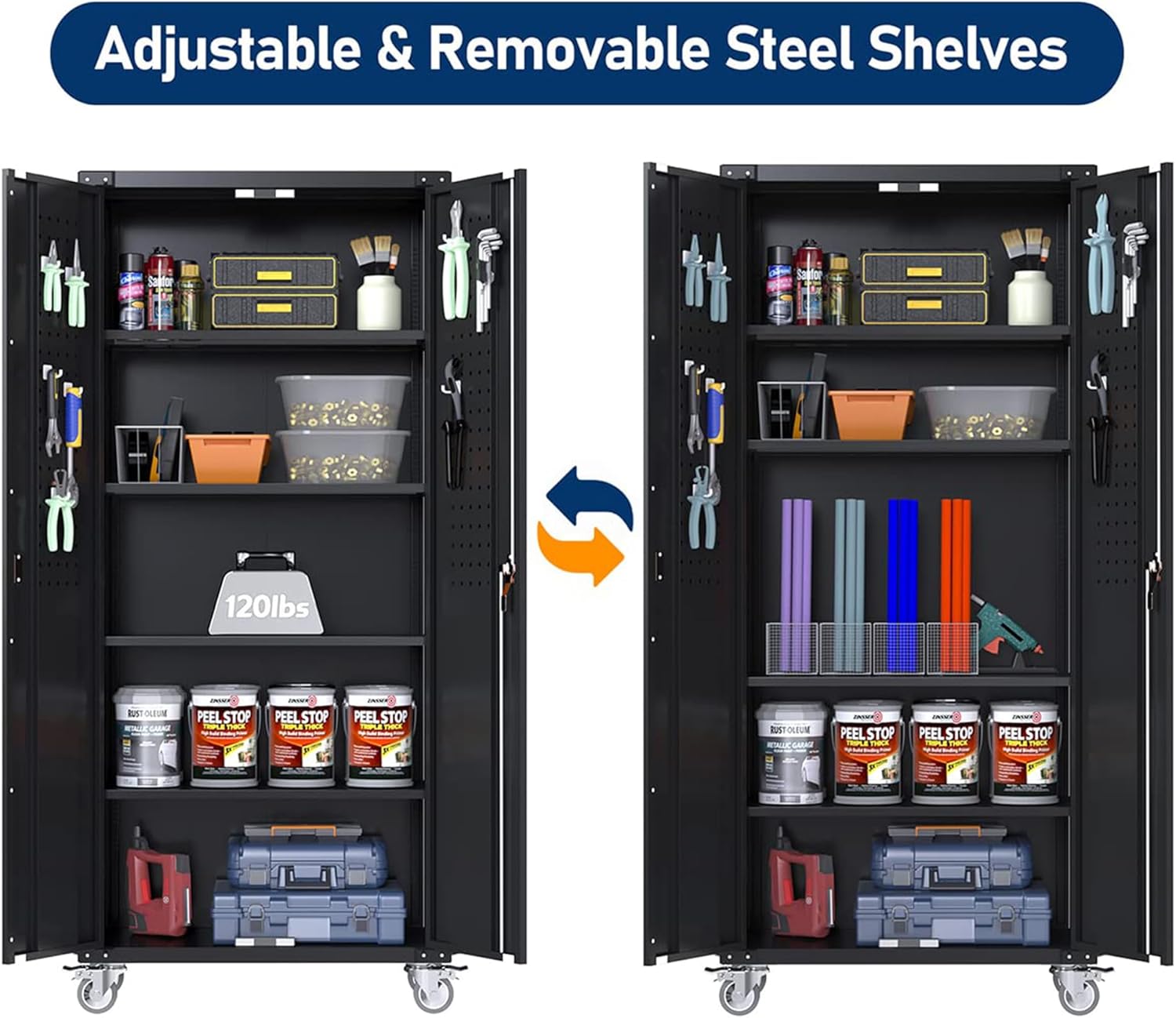 - ăUtility Pegboard & Adjustable Shelves ăRedesign your organizing ways, hang up everything on the door, get effortless accessible for a variety of small hardware, no more searching for things among the clutter. Tall Garage storage cabinet with wheels is designed with 4 adjustable shelves, you can easily meet your different storage needs by adjusting the height between the shelves.
