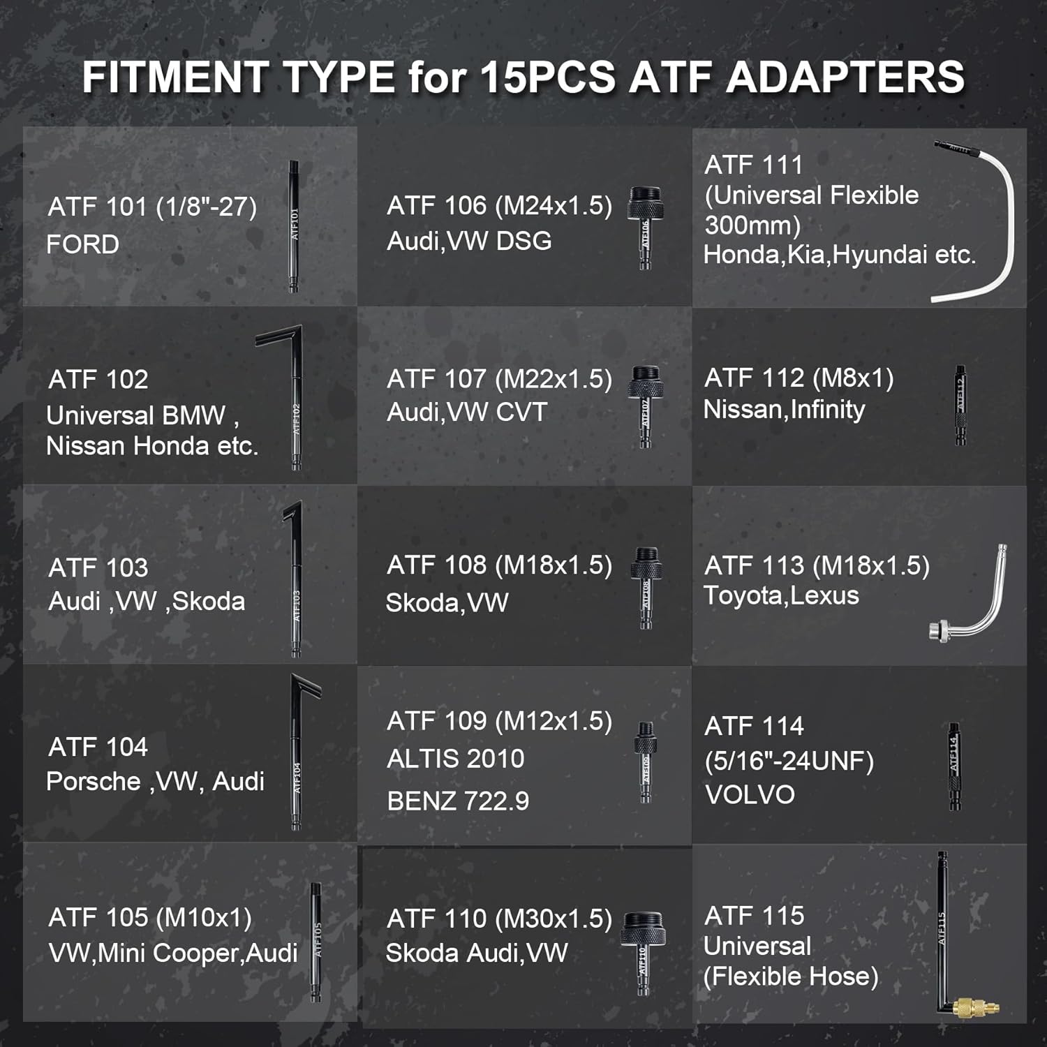 • 15PCS ATF Adapters: Fluid pump kit contains 15 transmission fluid adapters, which metal part is made of hardened steel with black electrophoretic surface treatment for rust and corrosion protection. Adapters are labeled with NO. for finding the suitable model quickly from manual. A variety of adapters allow the ATF refill kit to fit various models such as Ford, BMW, Nissan, Honda, Audi, VW DSG, VW CVT, Skoda, Porsche, Benz, Mini Cooper, Kia, Toyota, Hyundai, Infiniti, VOLVO, Lexus