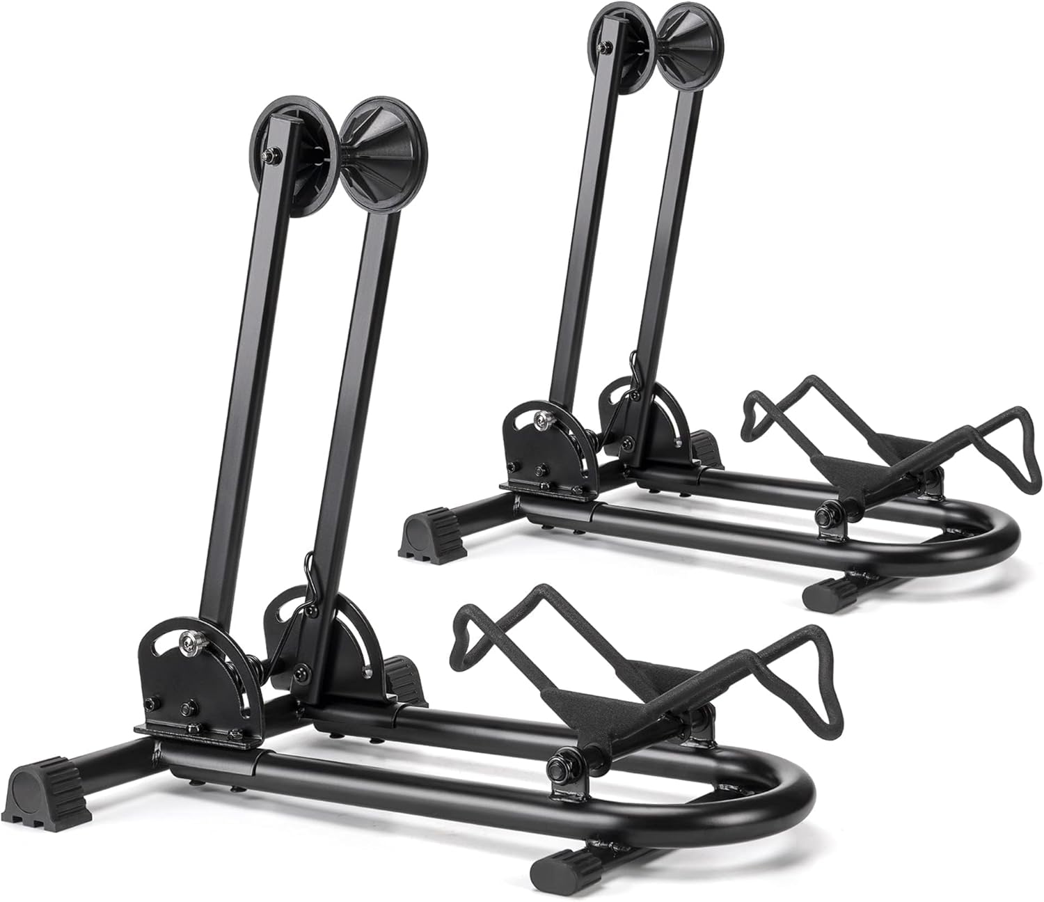 - 【FREESTANDING INDOOR BIKE RACK】: The collapsible bike stand uses an innovative spring-loaded three-point hold of the bicycle's wheel. You roll the front or rear wheel into the self-adapting lower cradle, and the spring-loaded arm locks around the tyre to give a secure three-point upright hold. It is a far better way of storing a bike than leaning it against a wall and it keeps delicate drivetrain and disc brake components away from potential knocks and drops.