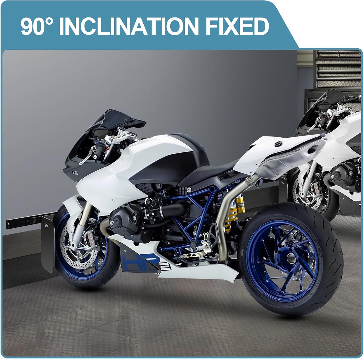 - Easy to Use:Use motorcycle wheel chocks to secure your motorcycle to L-Track rail Mount multiple bikes in tight spaces with the bike wheel chock mounted at a 90-degree angle. Keep your bike organized and accessible by installing motorcycle front tire chocks at a 45-degree angle.