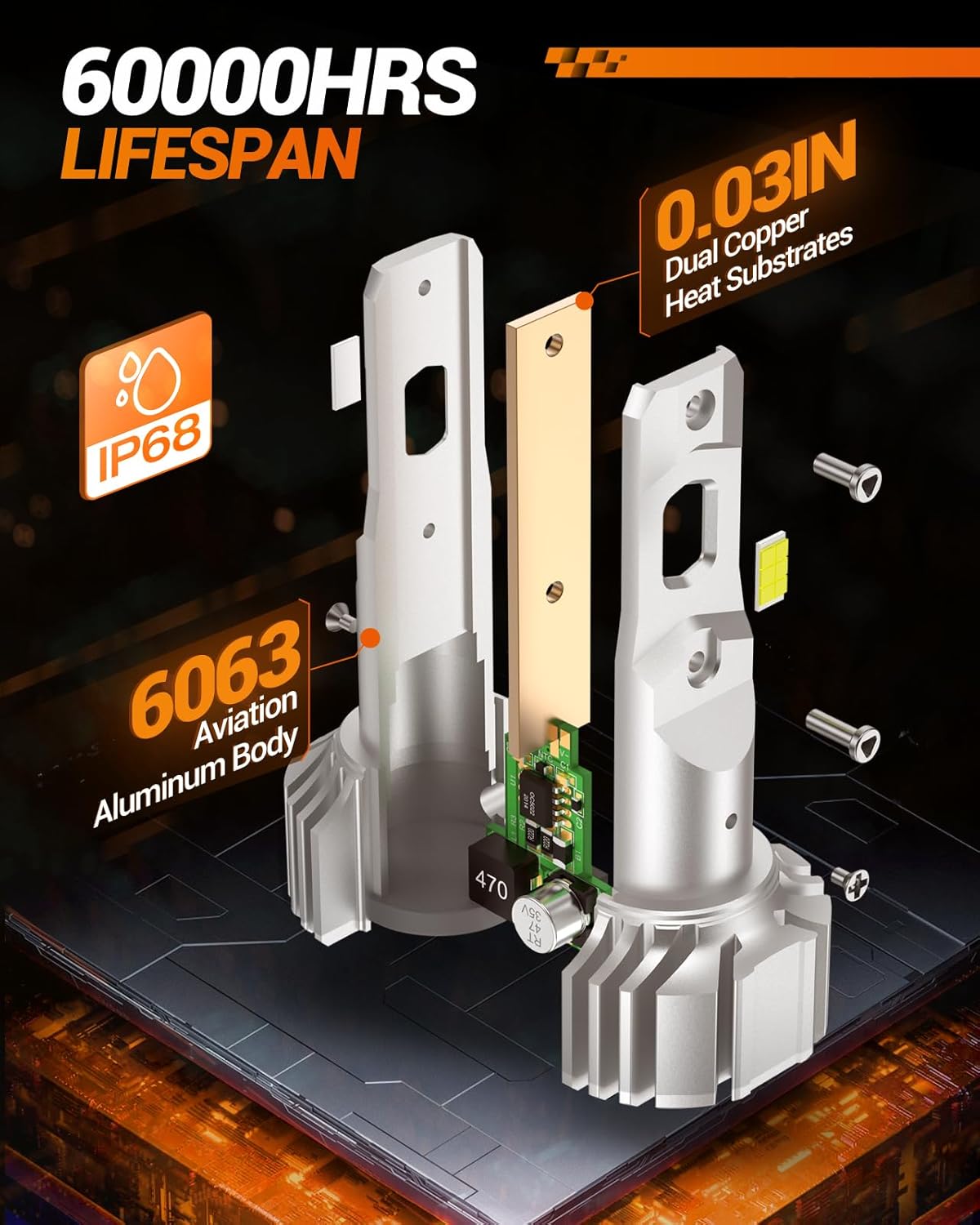- 60,000-Hours Lifespan: After hundreds of testing and analysis of the durability and heat resistance, we have chosen Military-grade aluminum materials for XF3 Series 5202 fog light bulbs led. 0.03in Double-layer Copper Heat Substrates, equipped with an efficient heat dissipation system. This not only reduces the strain on the vehicle's electrical system but also ensures its lifespan of up to 20 years
