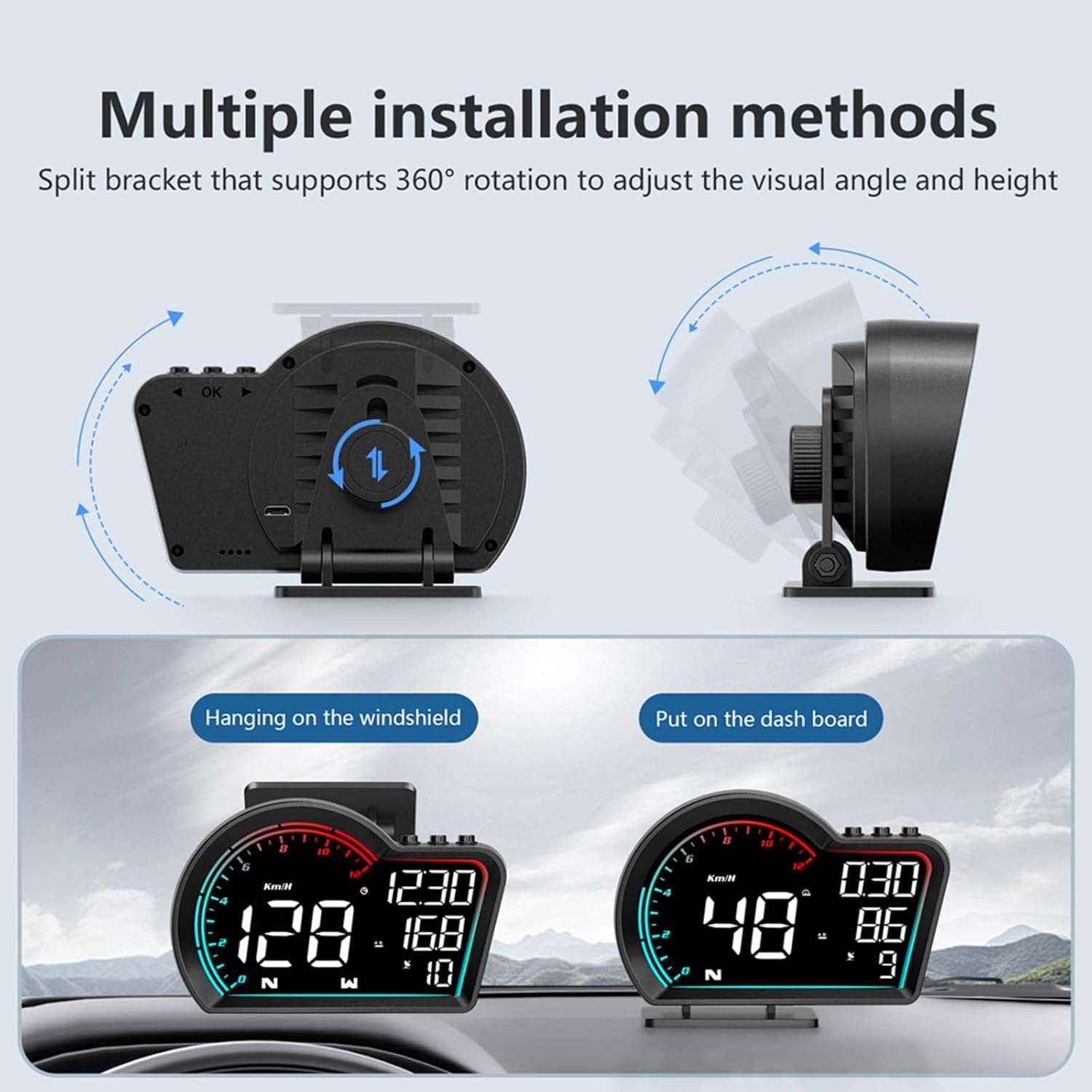 - MULTI-FUNCTIONAL DISPLAY: Equipped with a 5-inch HD LED screen for clearer information display, our HUD offers a range of features including speed KM/H & MPH, clock, compass, travel time, travel distance, number of satellites, acceleration time, altitude, fatigue driving, and speeding alarm. It's packed with technology to bring more safety and fun to your driving.