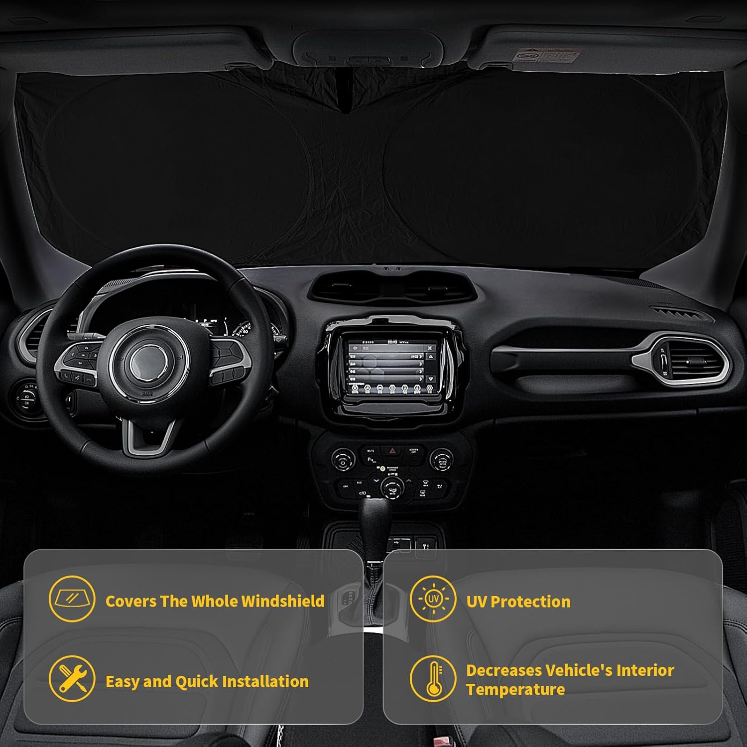 - â ăUnique Design ăBuy it now,The sunshield cover sun shade easily pops out and folds back. Storage pouch is included for easy portability,Good gift for all friends. Great accessories fit for your Jeep Renegade SUV 2015-2023. Have a rest in the car,protect yourself,your kids,your family.