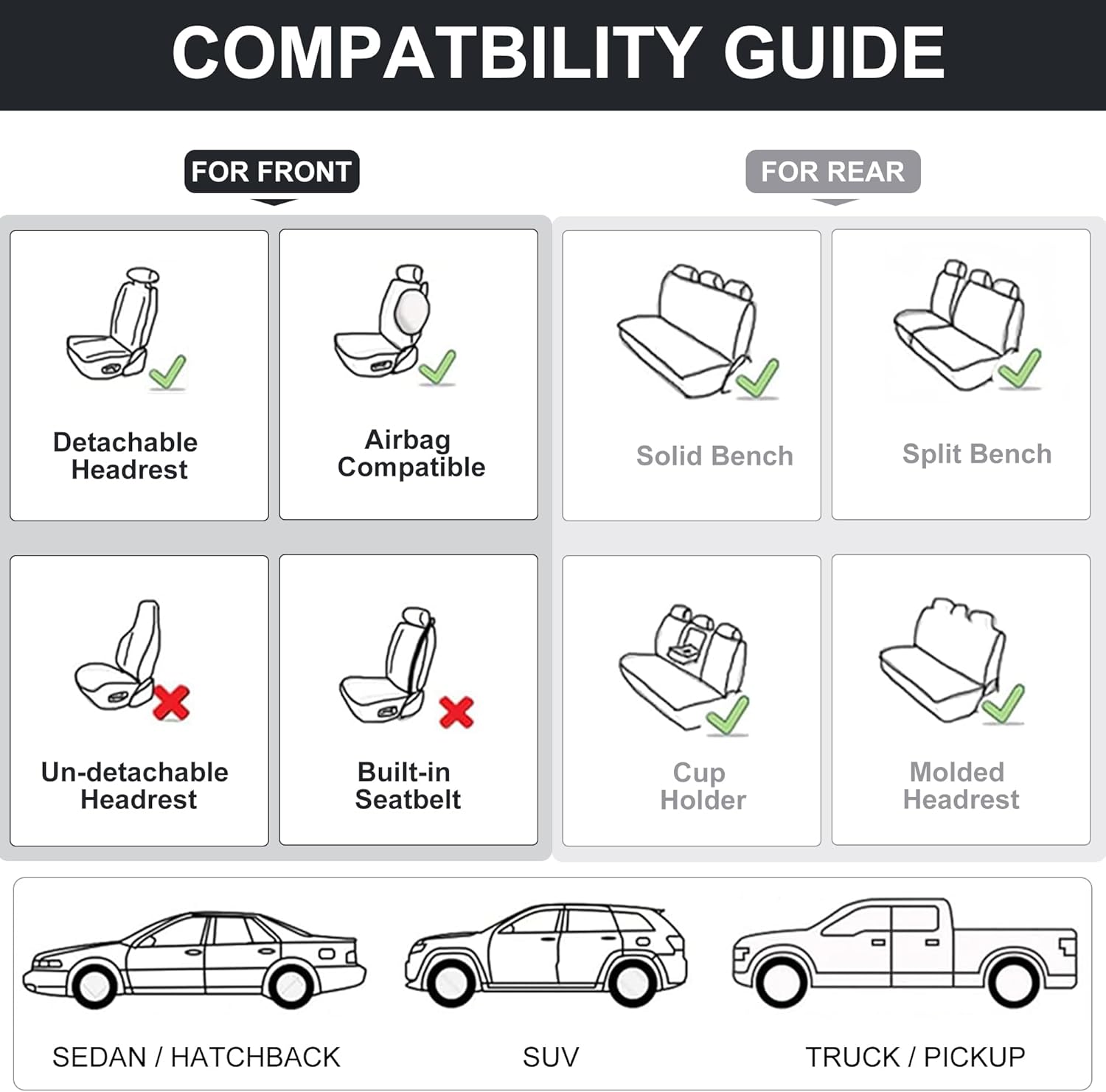 - Easy to Install: Each pack comes with full-set car seat covers (front and rear seat covers), a hardware bag of hooks and chucks, and an installation manual. Designed to fit 50/50, 40/60, and 60/40 split rear benches. Please confirm the width of the rear seats is less than 56 inches before purchase
