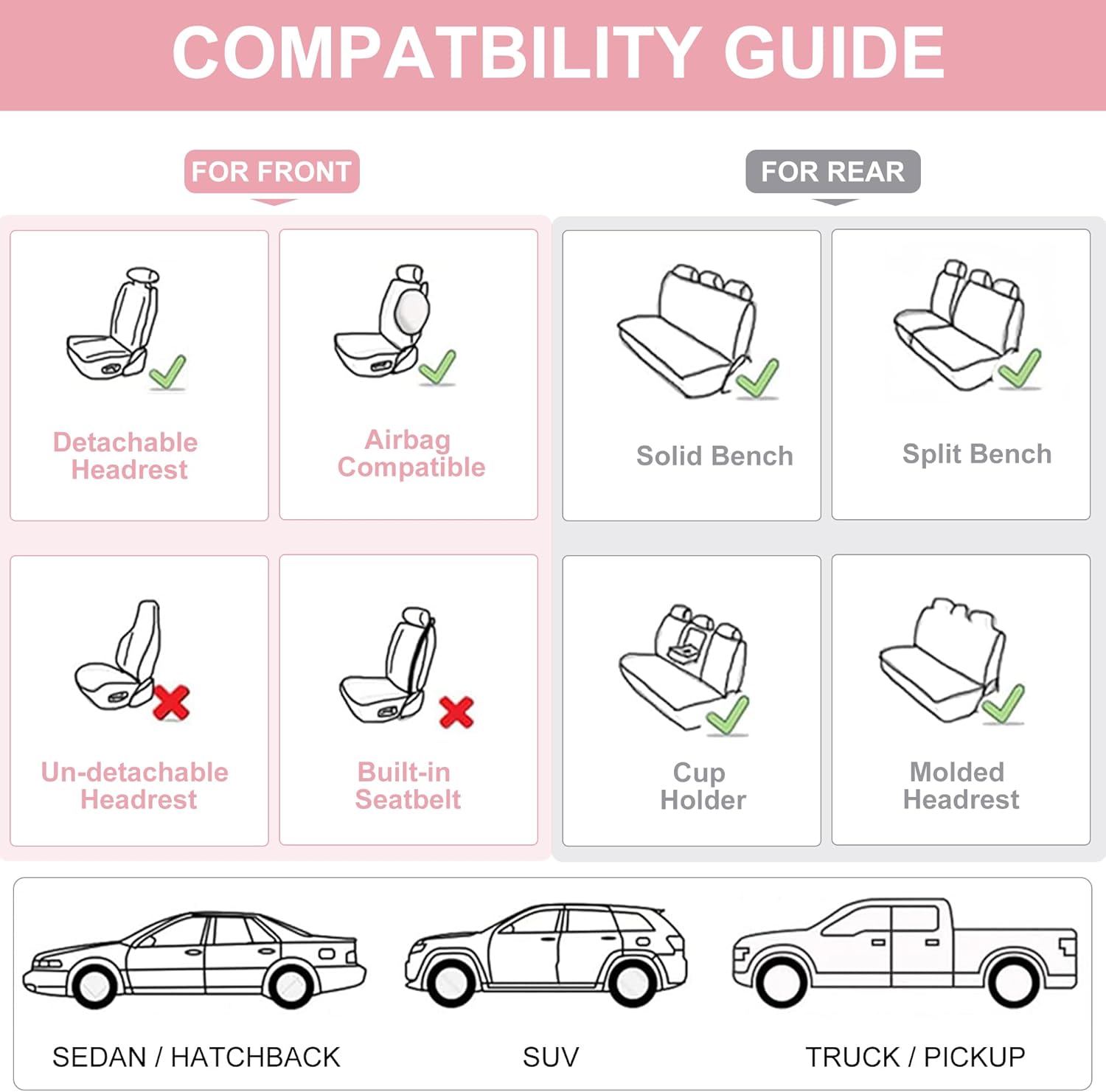 - Easy to Install: Each pack comes with full-set car seat covers (front and rear seat covers), a hardware bag of hooks and chucks, and an installation manual. Designed to fit 50/50, 40/60, and 60/40 split rear benches. Please confirm the width of the rear seats is less than 56 inches before purchase