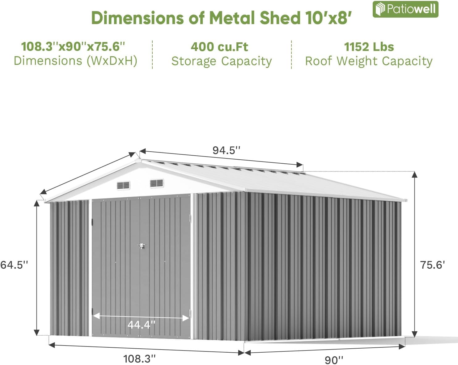 - Dimensions: The 10'x8' metal shed offers a total floor area of 85 square feet, providing sufficient space for storing garden equipment, tools, bicycles, and other items. With a peak height of around 6.3 feet, it offers ample headroom for most users to move comfortably inside.