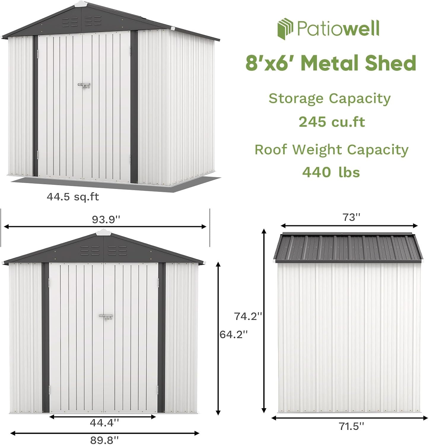 - Spacious Storage Space: 8x6 FT Overall Dimensions: 89.9” x 71.5” x 74.2” (L x W x H). And this metal tool shed has a large storage space inside, which can store most of the tools you will use in your daily life such as mowers, ladders, tool kits and other items to keep your yard clean. The design of the tall walls also allow for plenty of headroom to work, hang tools or stack something according to your needs.