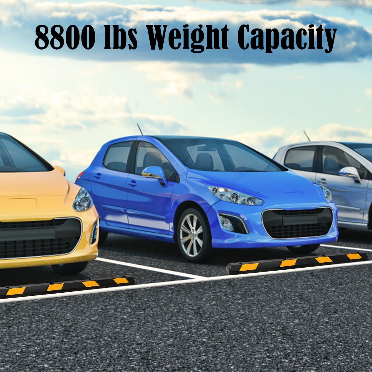 - All-Weather Rubber Parking Curb: Engineered from supple rubber, this garage parking aid supports up to 8800 lbs, providing durable collision prevention for cars, trucks, RVs, and trailers. Its robust design outperforms concrete parking blocks, withstanding elements like rain, snow, and oil.