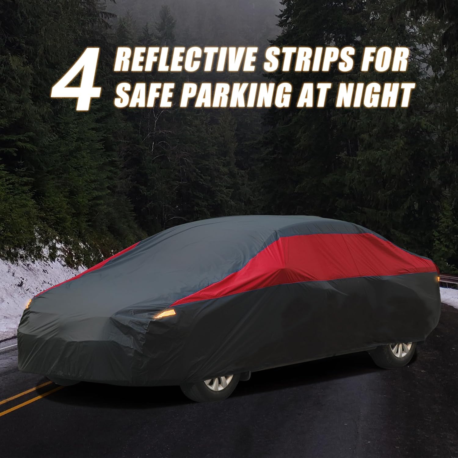 - ăPowerful Functionsă1> 4Pcs reflective stripes remind other people in the night, avoid accident in dark environment 2> The elastic hem at the bottom makes the car cover fit the car better 3> Windproof straps can prevent the cover from being blown away by the heavy wind 4> Double stitch technology which makes the fabric stitched tighter&non-tearable, more durable than other similar covers.