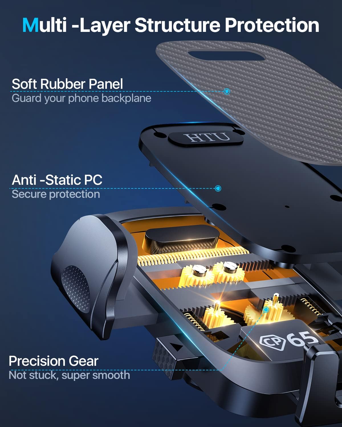 - [FULL PROTECTION]: Our phone holder for car, also known as a car phone holder, releases easily with one button and clamps fast with one hand! We adopted Shock-absorbing faux carbon fiber on this car cell phone mount, with more fitting solid silicone rubber on the 2-side clamps & holding feet to effectively avoid bumping, scratching, flying out, and abnormal noise on your cell phone at all times. Your device will stay secure on the car phone holder without any scratching of the vent blades.