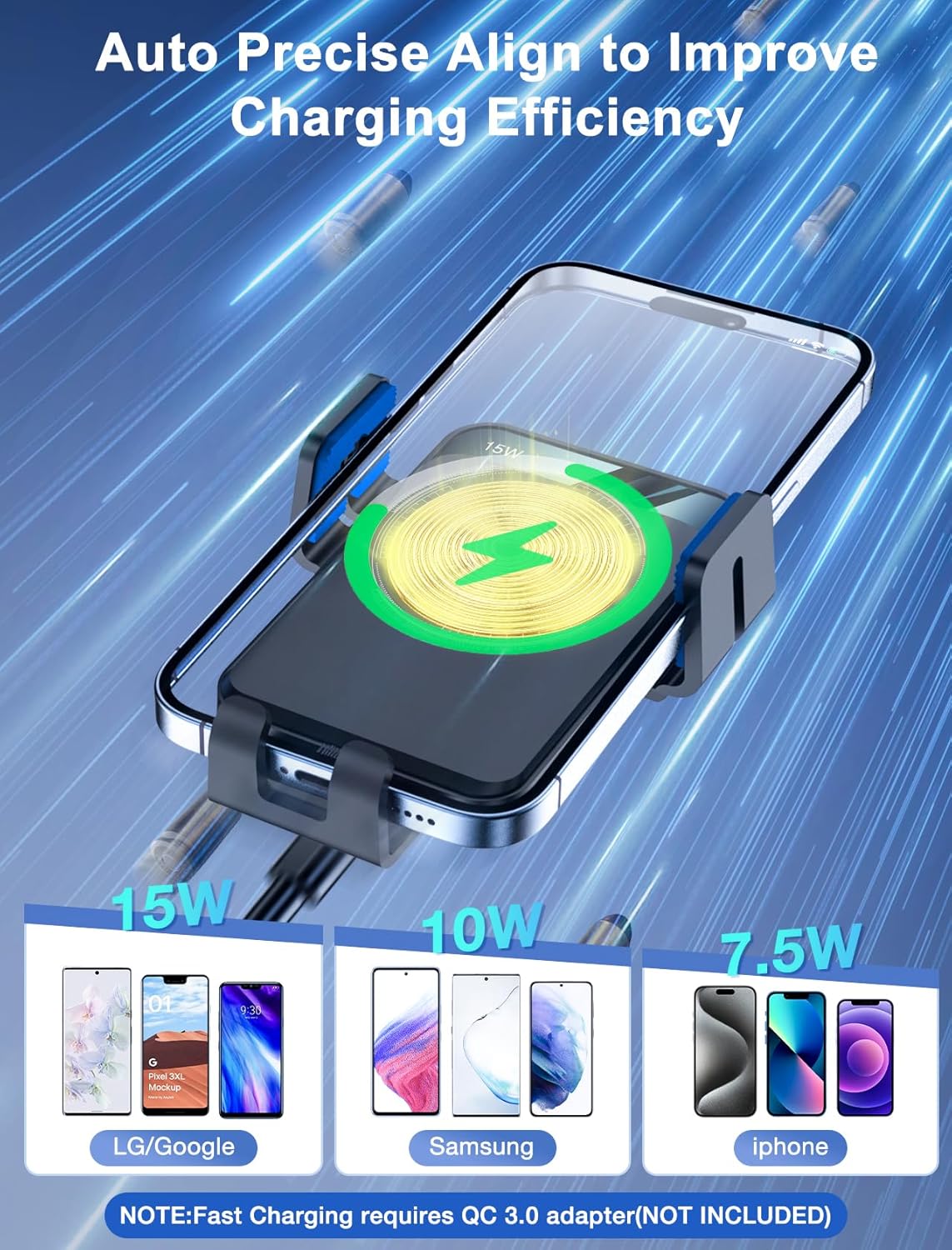 - ăWireless Car Chargeră15W Wireless Fast Charging for LG V50/V40/V30/G8/G7; 10W for Samsung Galaxy S23 Ultra/S23+/S23/S22 Ultra/S22/S21/S20/Note 20/Note 10+/Note 10; 7.5W for iPhone 16 15/14/14 plus/14 pro/14 pro max/13/13 Pro/12 Pro Max/12 Pro/12/11 /11 Pro /11 Pro Max /SE /XS /X/XR/8 Plus/8; Note: 15W/10W/7.5W Fast Charging requires QC 3.0 car charger (NOT INCLUDED), 5W standard wireless charging for other wireless charging Phones (5V/2A adapter is required).