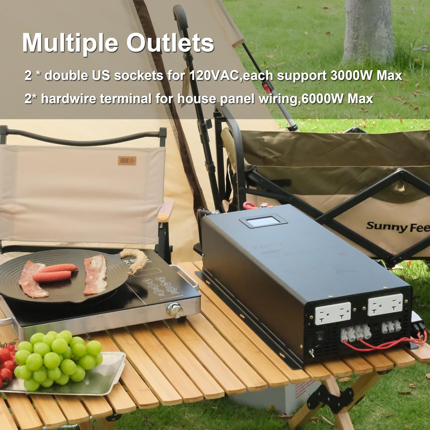 - FEATURES: 2 circuit 120v AC outputs with 4 AC outlets ,each circuit can support 3000W output at the same time ,one circuit 240VAC with max 6000W output ,one AC hardwire terminal with Multiple output (L1+L2=240V, L1+N=120V, L2+N=120V )
