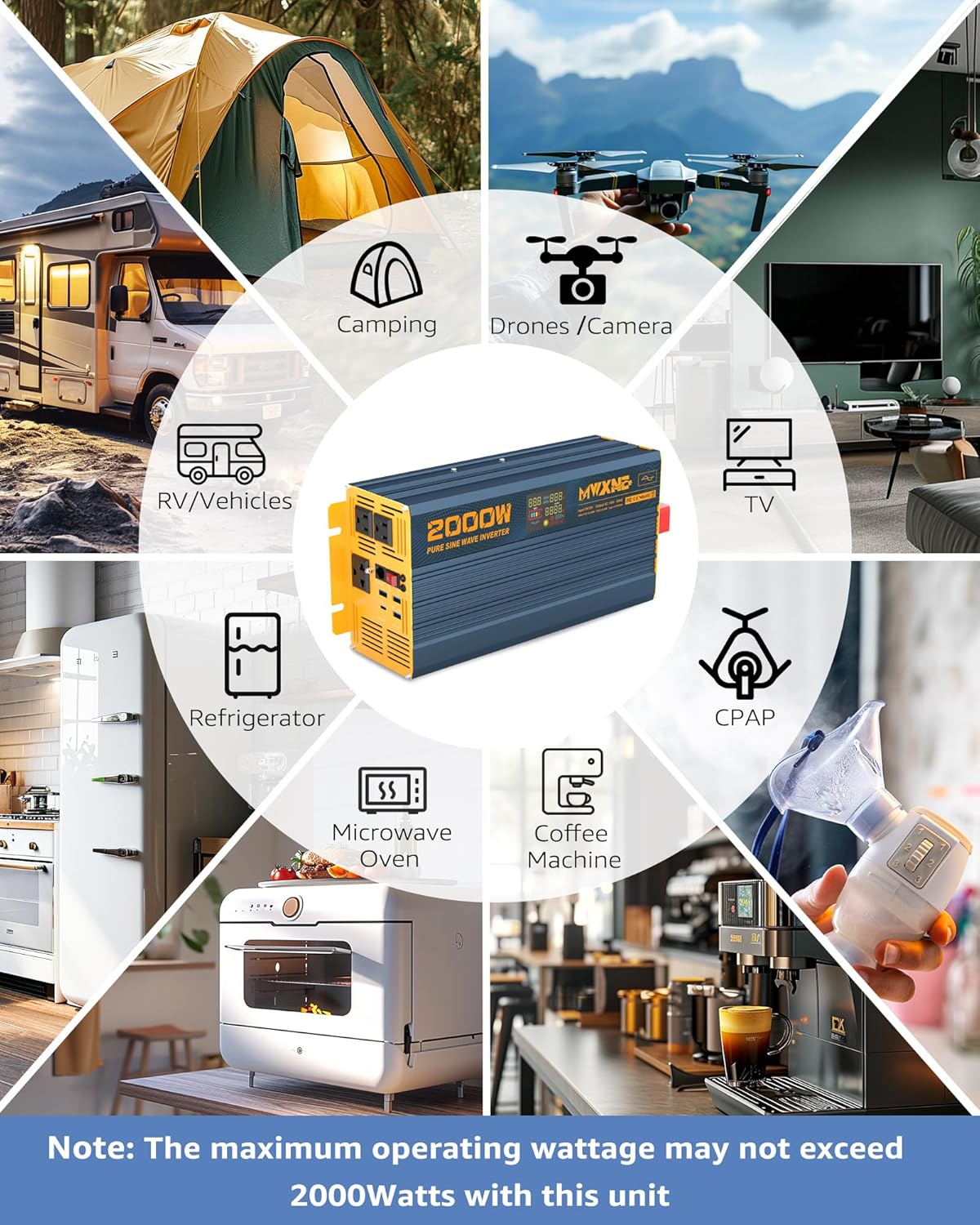 - 【FAST CHARGING USB PORTS】MWXNE Upgrade fully 2000 Watt Power Inverter converts 12V DC to 110V 120V AC with 3 AC outlets, 2 18W USB-A ports,a 24W USB-A port and 60W USB-C(TYPE-C) PD port for fast charging. 4 USB ports can power multiple devices at the same time.It is convenient for you to use in various environments and share with your family and friends.