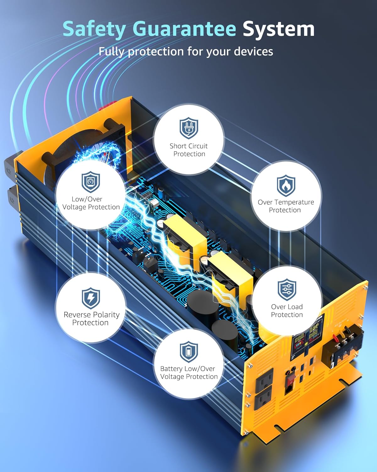 - ăFULLY SAFETY PROTECTIONSă Pure sine wave inverter has passed FCC CE ROHS PSE certification. Designed with isolated input/output stable design offers under-voltage protection, overvoltage protection, overload protection, overheating protection, and short circuit protection to ensure safety.