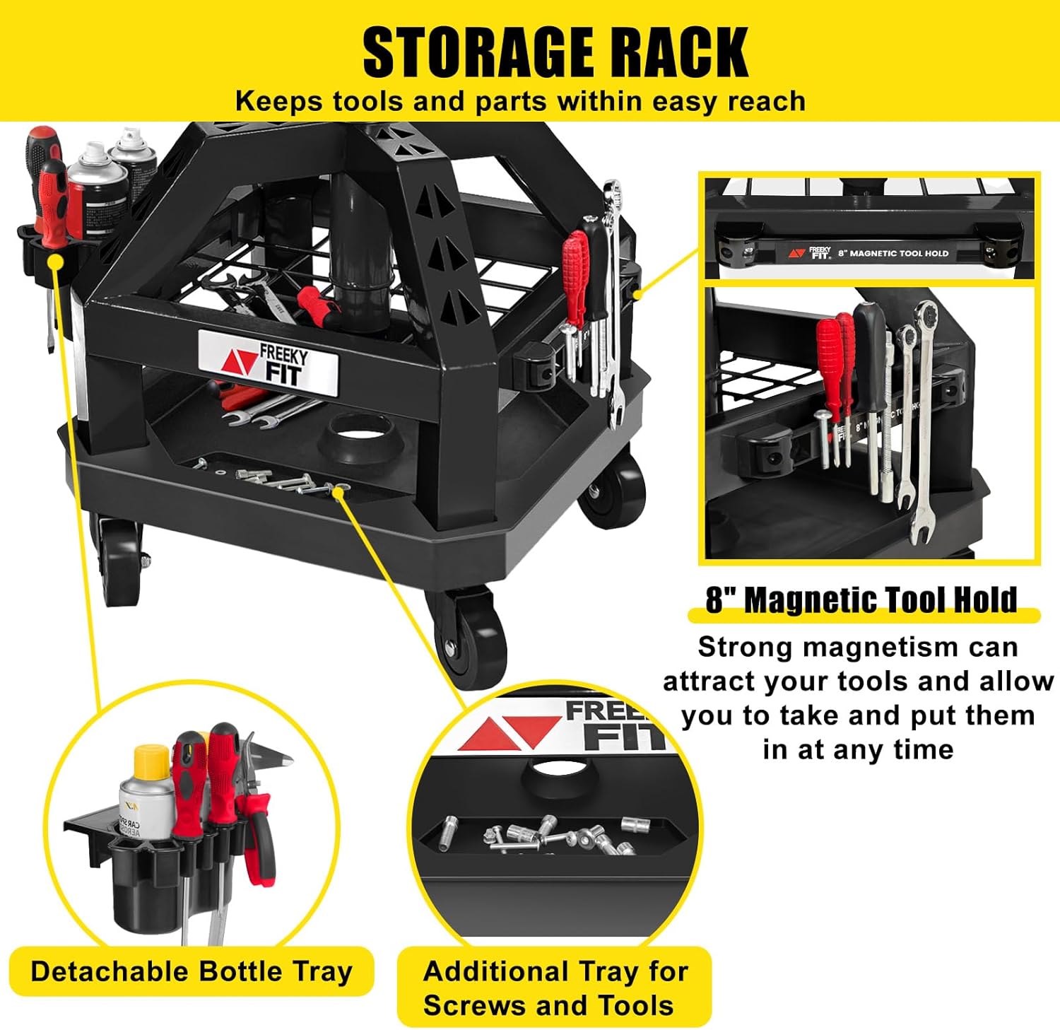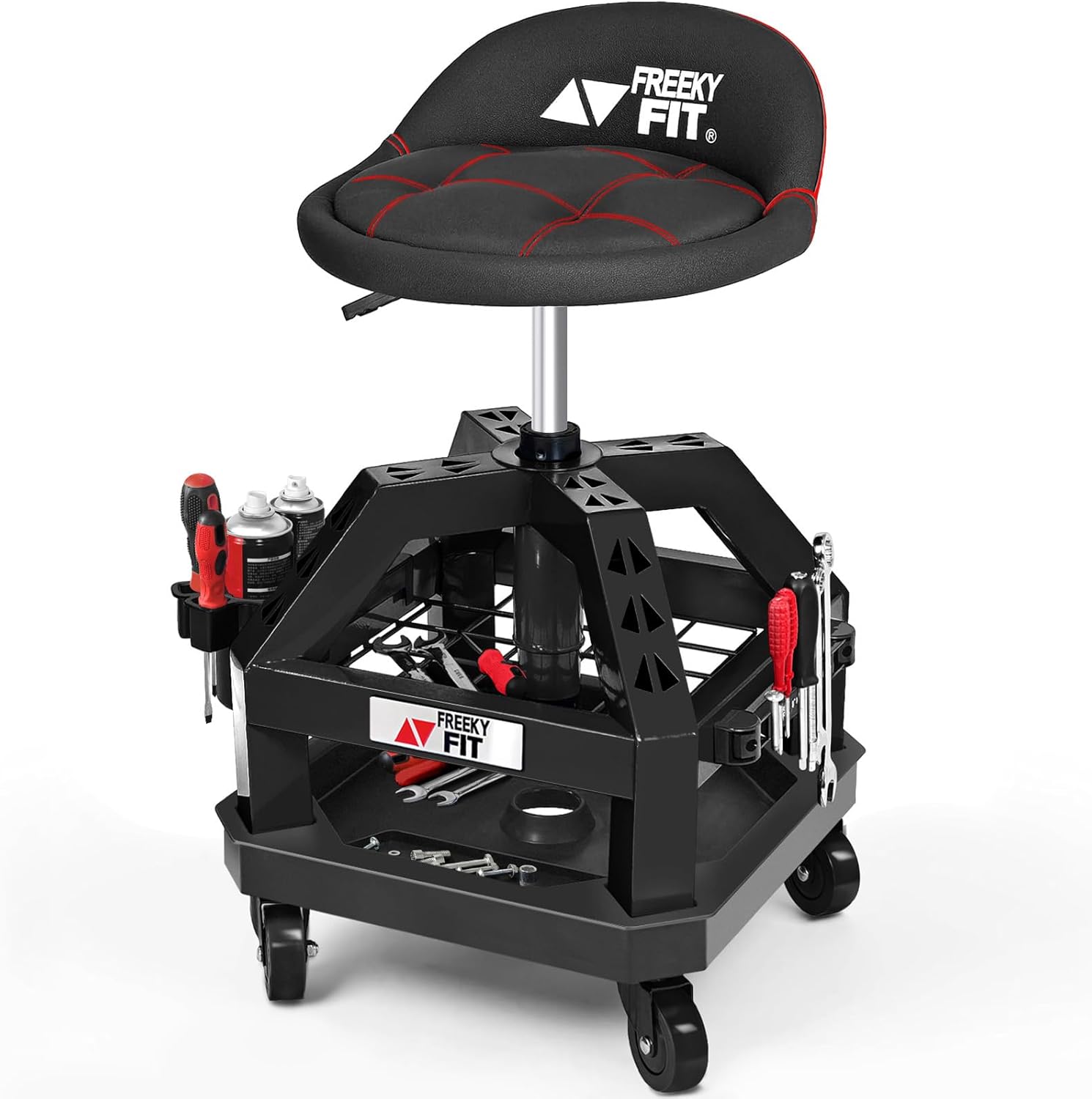 - Engineering Design & High-Storage: Our Rolling Seat with square tube and steel ring structure provides space for resting the feet, and the design of this automotive repair chair includes two tool trays located under the seat. The first layer is a metal mesh tray, and the second layer is a solid plastic tray, making it convenient to store and access necessary tools and parts. In addition, we are also equipped with utility tool rack. It helps to keep the work area tidy and reduces the need for frequent tool movement