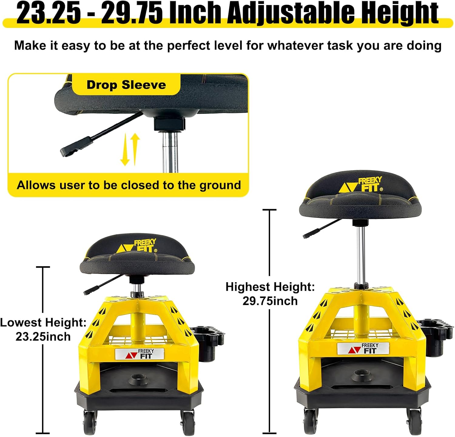 - Adjustable & Non-Marring Rolling Wheels - This Rolling Pneumatic Creeper is equipped with a pneumatic height adjustment mechanism, allowing users to easily adjust the height according 23.25-29.75 inch to their preference and working needs. This ensures optimal comfort and flexibility. It‘s also has smooth-rolling wheels that enable easy mobility around the work place. This allows mechanics to move around effortlessly while working on different projects