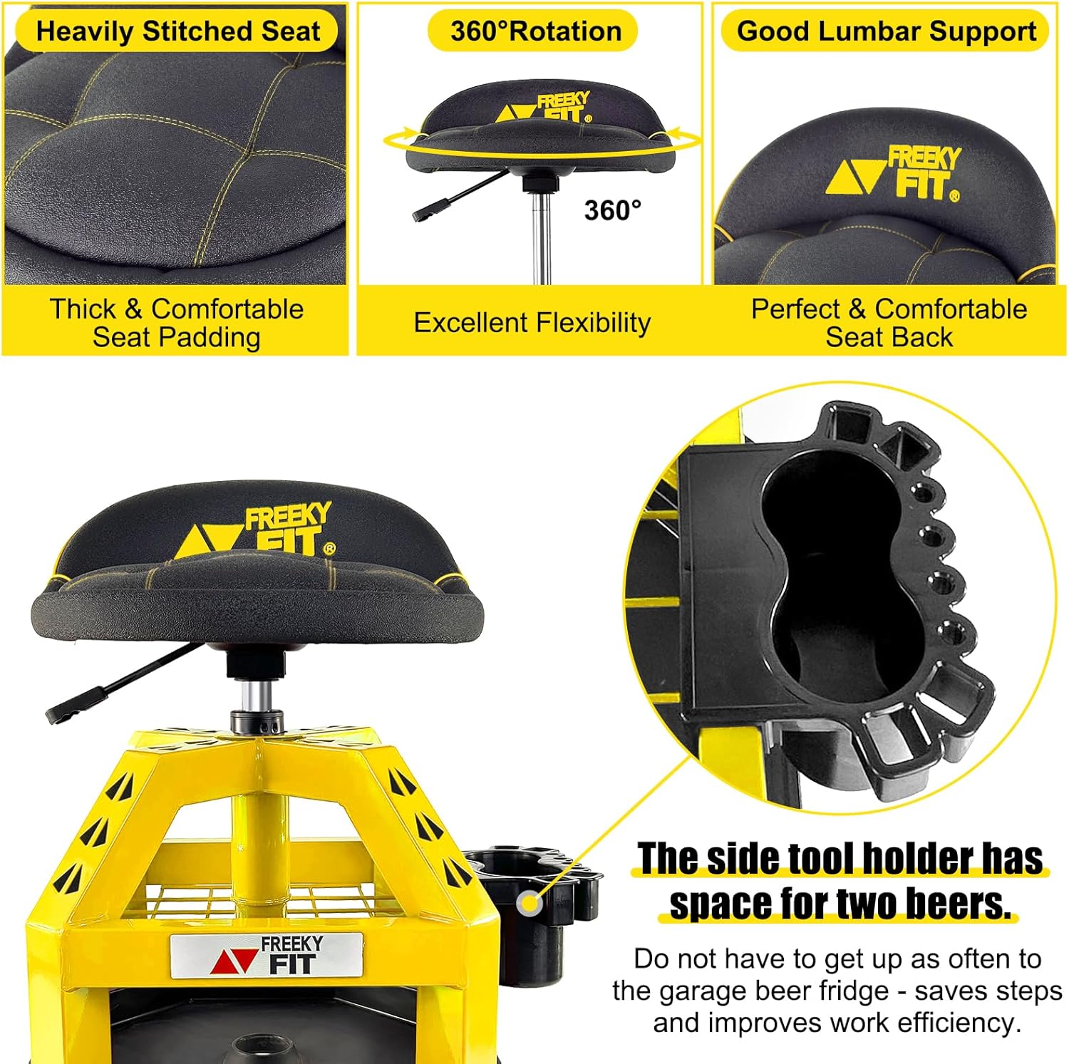 - Comfortable & Supportable - The Freekyfit shop stool features a comfortable high back lumbar support that provides support and reduces fatigue during long hours of work. It helps maintain a proper posture and reduces strain on the back. This seat is padded with high-quality memory foam, ensuring comfortable even during extended periods of sitting. It provides cushioning and support to the user