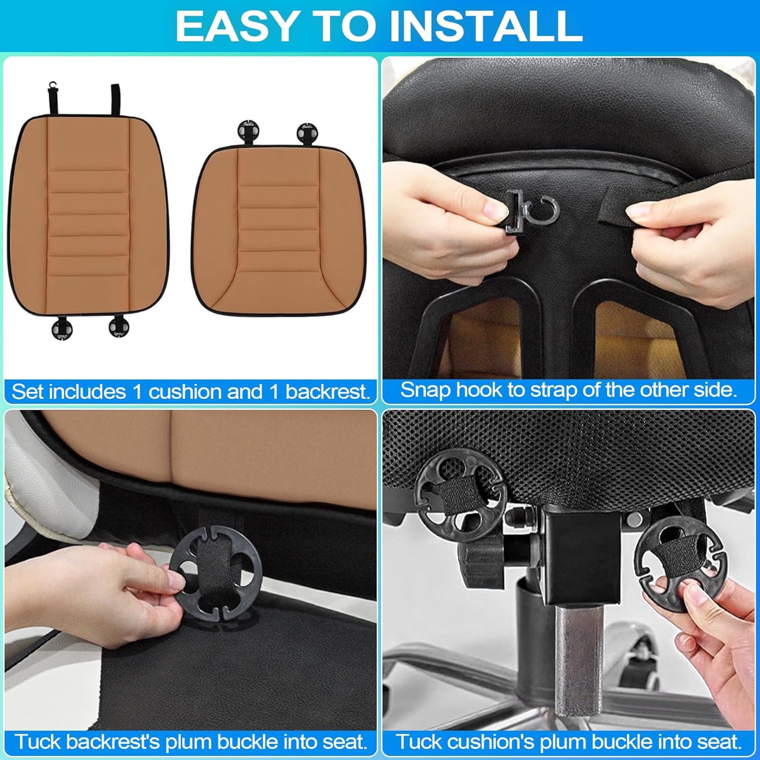 - 【Safe Design】Cushion and backrest set features leather edging and plum buckle design that allows airbag and seat belt socket to deploy. Tip: Car cushion sets are compressed and packed tightly, it may be a little wrinkled. Please wait 15 minutes after opening to allow it to level off.