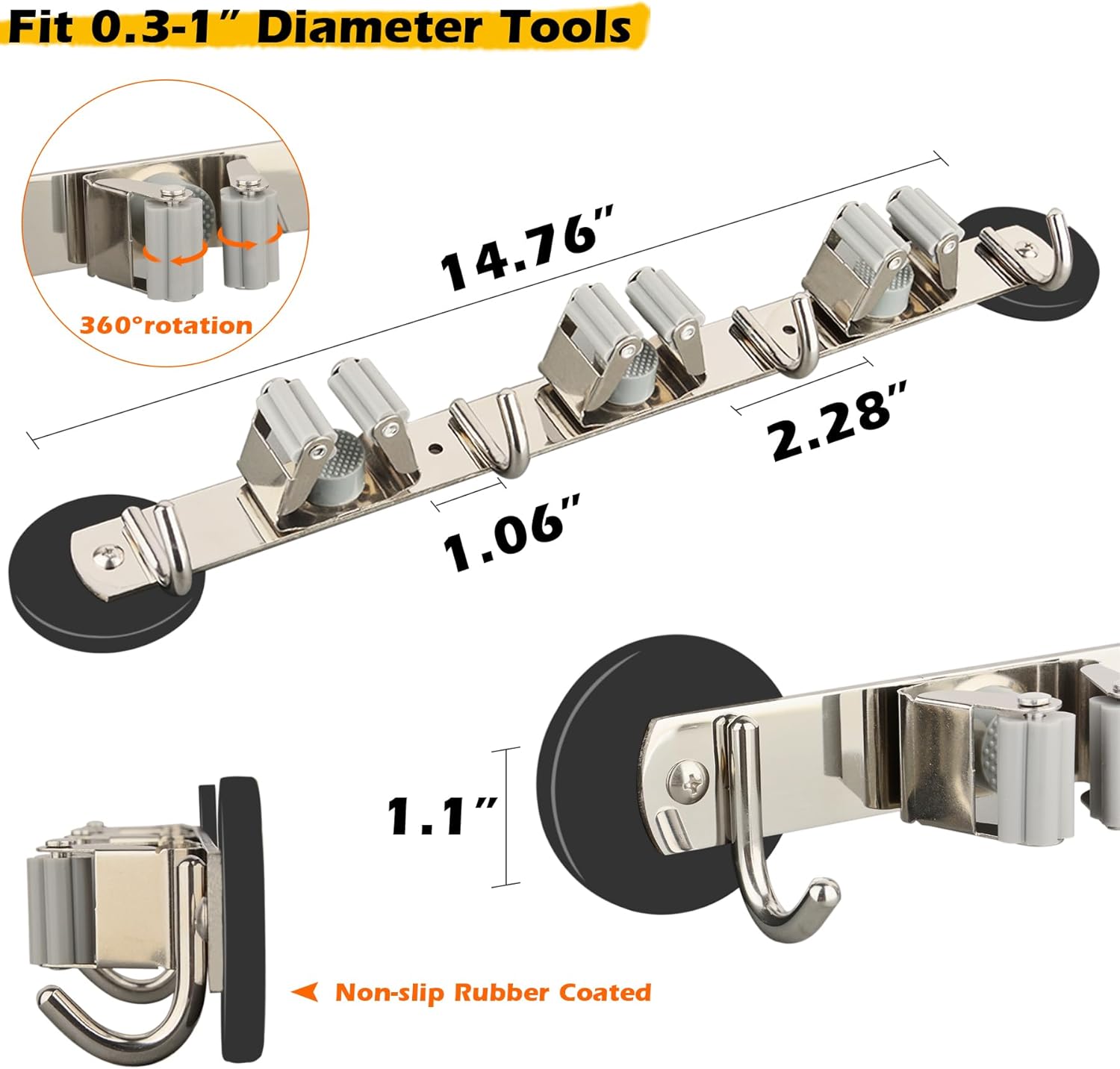 - [Strong Magnetic Mount Mop Holders] Hole-free and heavy-duty, the magnetic broom mop hanger can accommodate various sizes of cleaning tools. You can easily adjust the position of the tools to find the best fit and ensure they stay securely in place
