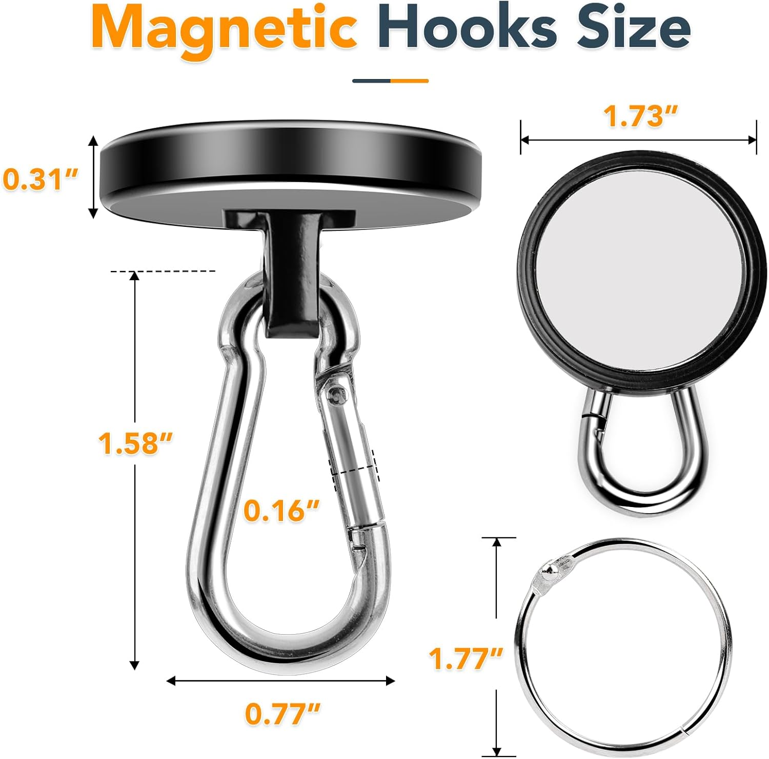 - STRONG MAGNETIC HOOKS: Our magnetic hooks with swivel carabiner hooks are made of neodymium magnets to ensure strong attraction. The holding capacity can reach 200 lbs vertically and 66 lbs horizontally, heavy duty magnetic hooks are suitable for hanging