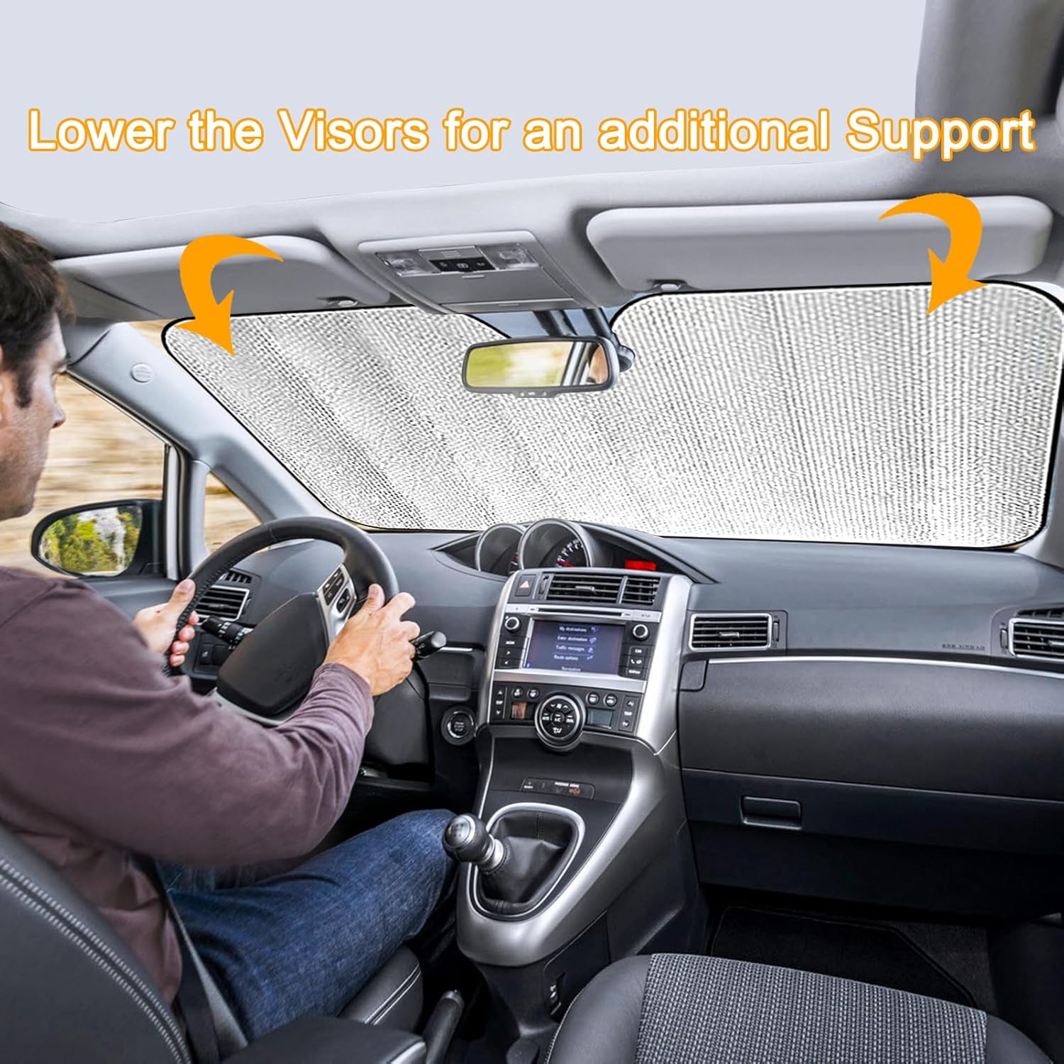 - PERFECT SIZE: Our windshield sunshade small size is 70cm x 130cm/27.5 inches x 51.2 inches and large size is 76cm x 140cm/30 inches x 55 inches. They fit most standard cars, sedans, mid-size SUVs and trucks perfectly. Simply unfold the sunshade and place it under the windshield. Easy to fold, does not take up space in the car, easy to use and simple!