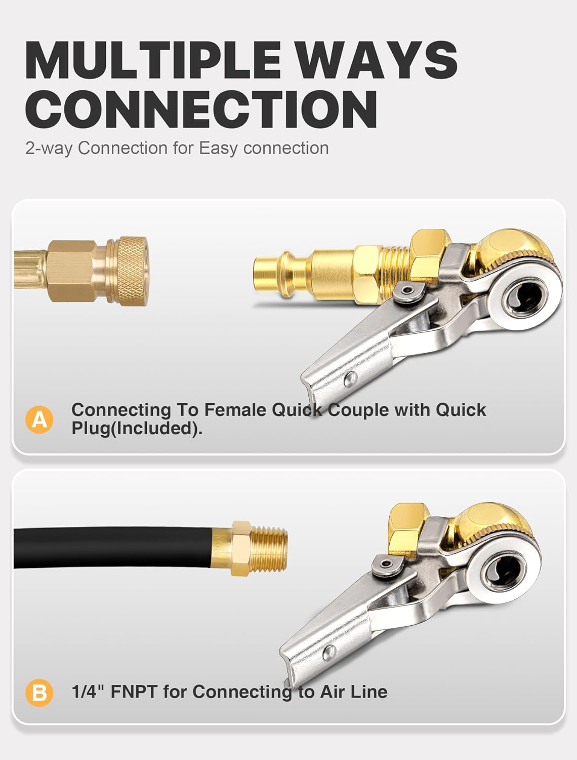 - 【Durable Brass Quick Plugs】: Made of high quality material for greater strength and durability, equipped with two standard brass quick plugs, for easy and swiftly connecting to air lines female quick couple. Making it easier to lock on the valve stem without air leakage, will serve you faithfully for years to come.