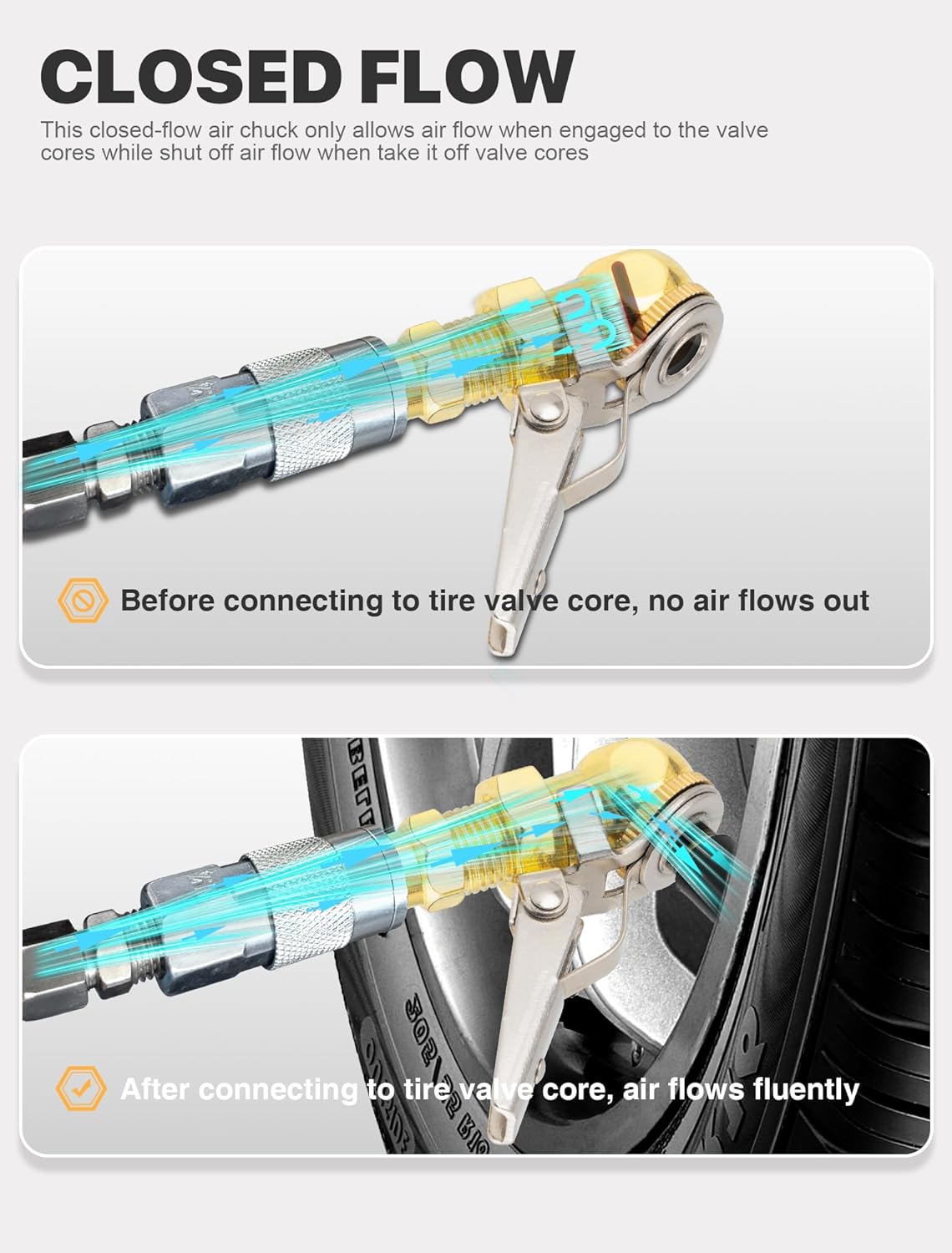 - 【Closed Flow Air Chuck】: This lock on air chuck built in shut-off valve, air only passed through when the air chuck is engaged with a tire valve. Maximum to 160 PSI air pressure, press to inflation easily and quickly, which is a perfect choice no matter for industrial or household use.
