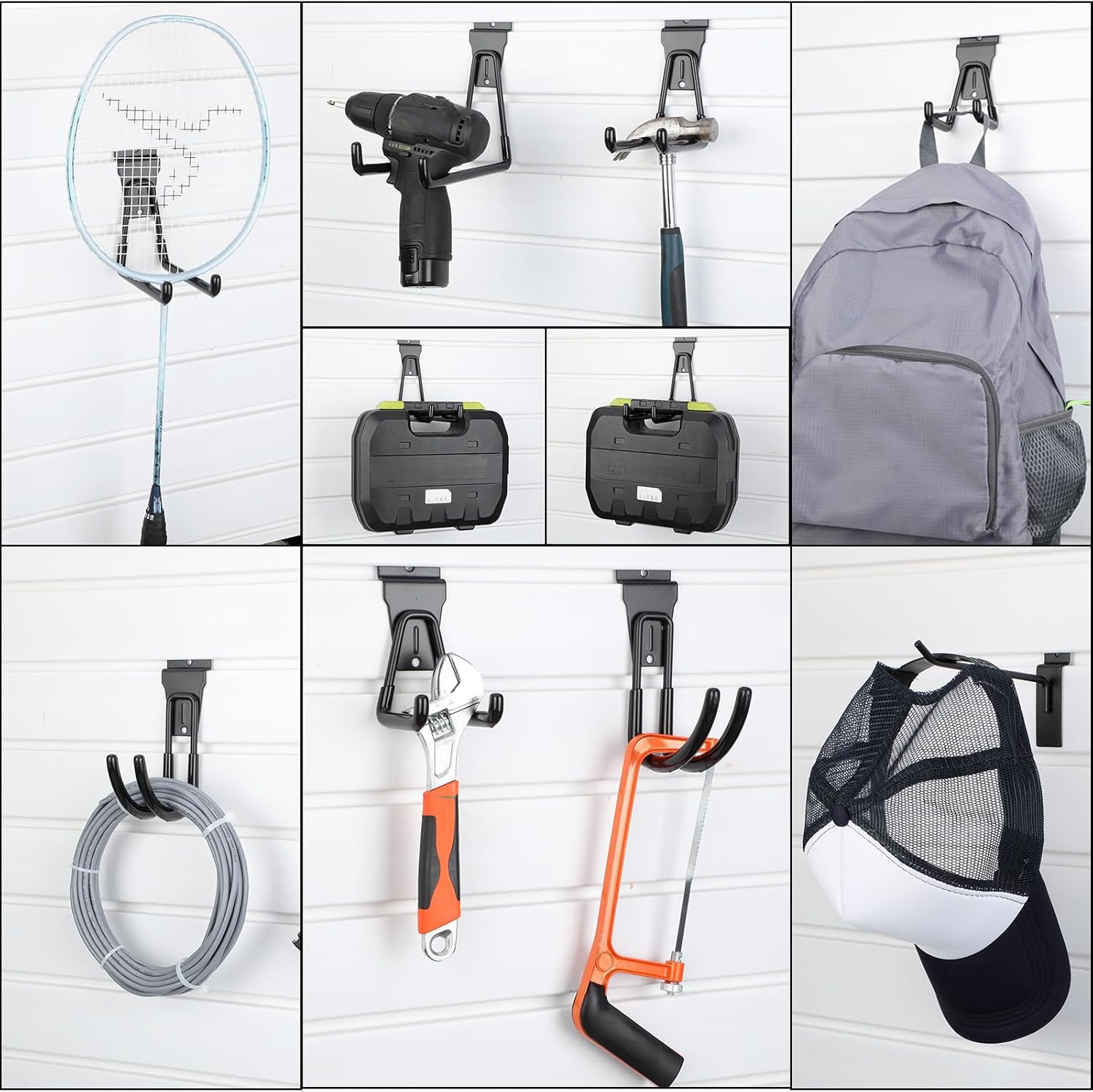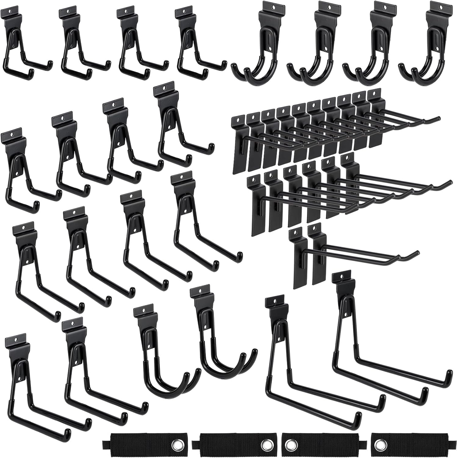 - Versatile Applications: this set of hooks and heavy duty storage straps offers wide ranging applications; It's a nice fit for your tool board, garage, retail and more; Use them to hang your garage tools, sports equipment, gardening tools, and various household items