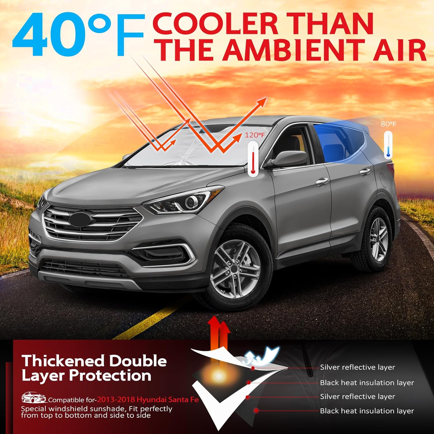 - KAYZT windshield sun shade is precise custom fit for 2013 2014 2015 2016 2017 2018 Hyundai Santa Fe, Thoroughly covers every corner of the windshield, Tailored to accommodate rear view mirror, Ensuring a seamless and snug fit without obstruction, Must have car accessories for Santa Fe