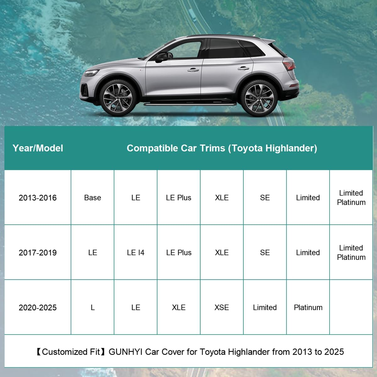 - ăCompatible withăThis Full Car Cover Custom fit for Toyota Highlander from 2013 to 2025. Comes with a microfiber towel that you can use to clean your car, because if there is sand on the surface of the car before use, it may damage the paint.