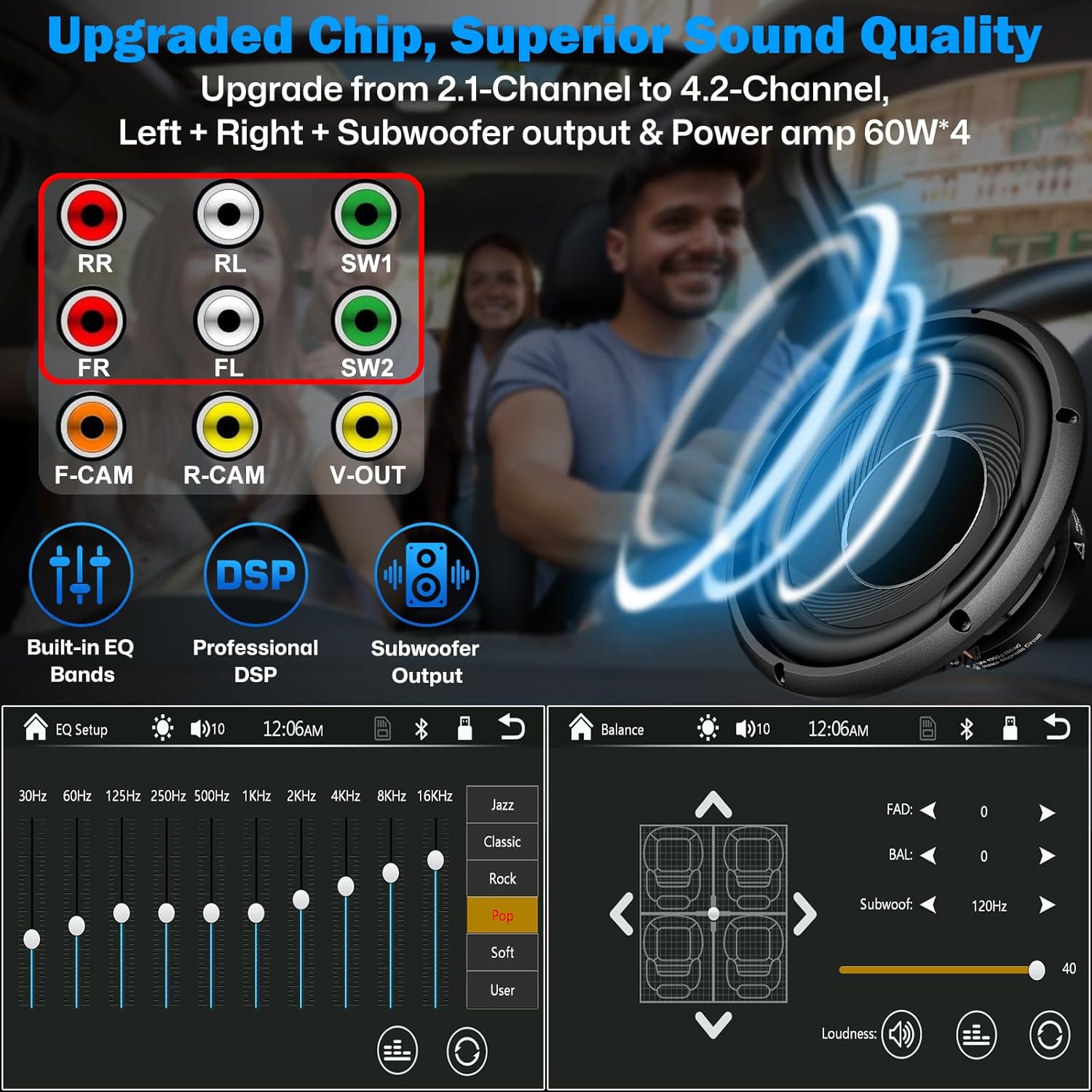- ă4.2-Channel Audio Output, 60W*4ăThis car radio supports 4 Channels RCA Audio Out for Connecting to Aftermarket Amplifier and 2 Separate Subwoofer Out, with max 240W output, FR, FL, RR, RL, adjusting music effect wherever position. You can enjoy the outstanding sound quality and breathtaking bass effects. Perfect for music enthusiasts and drivers who enjoy music in your cars