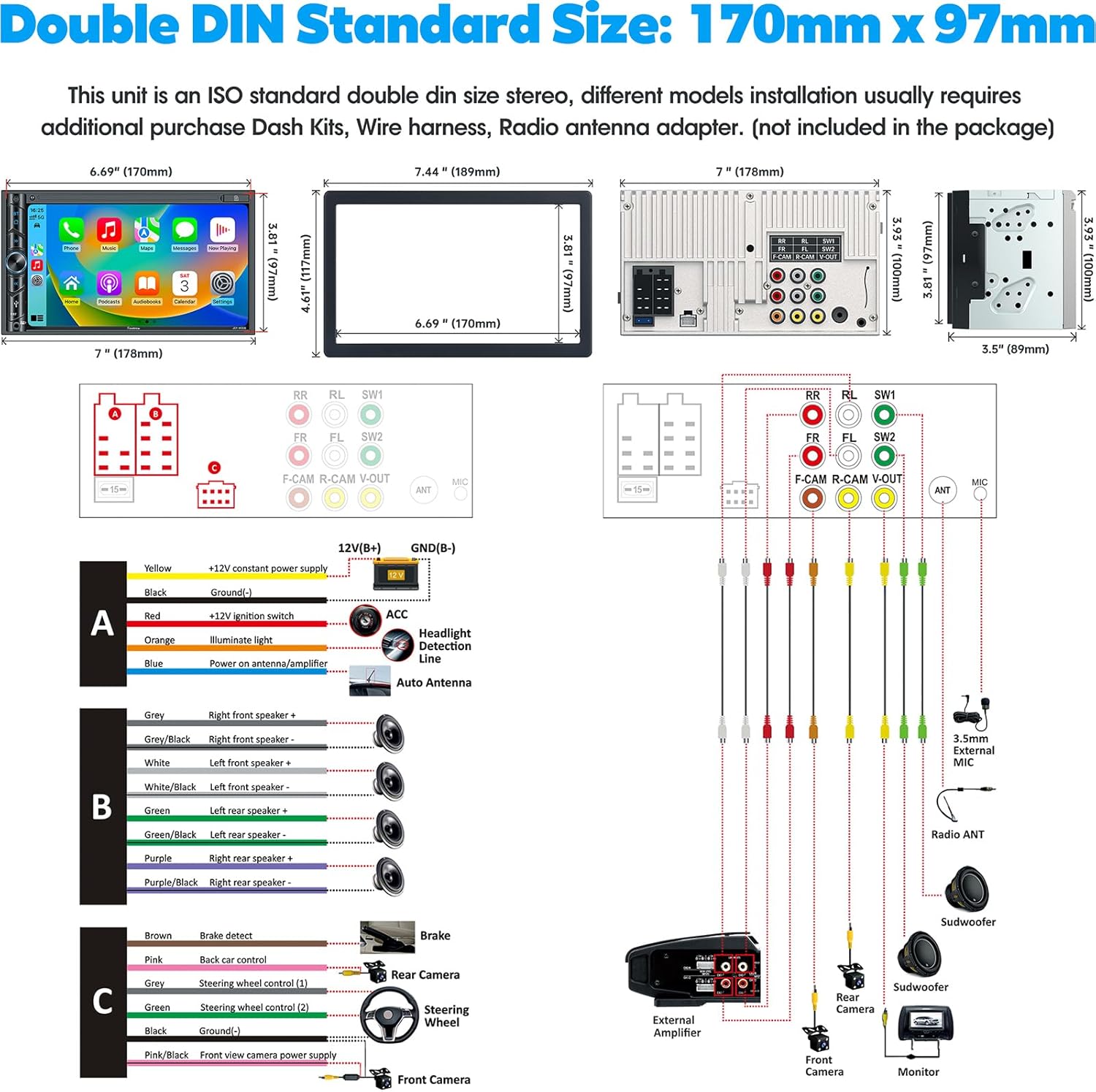 - Important Tips: Standard size: 170mm*97mm. Please make sure your dash board opening size fits our car stereo. If our stereo size does not meet your dash size, you would need to purchase an additional suitable dash kit; Please read the instructions before installation; Some cars may also require two additional after accessories to complete the installation: Wire harness adapter and radio antenna adapter for your car model. (WIFI connection means that the unit and the mobile phone connect via WIFI. It does not support WIFI hotspot connection.)