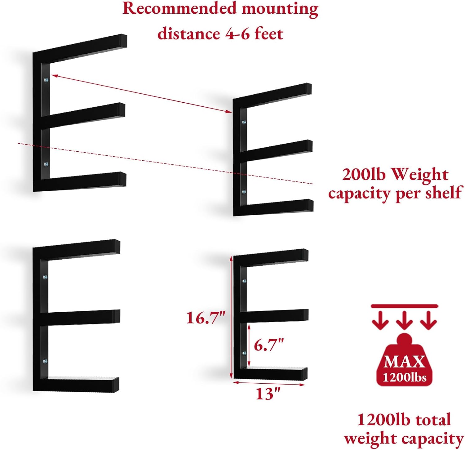 - 【Weight Capacity of 1200 LBS】Our lumber rack wall mounted is made of powder-coated 1⅙” (3 cm) steel tube construction。After many tests, each shelf can hold up to 2000 lbs, which means a total weight capacity of 1200 lbs