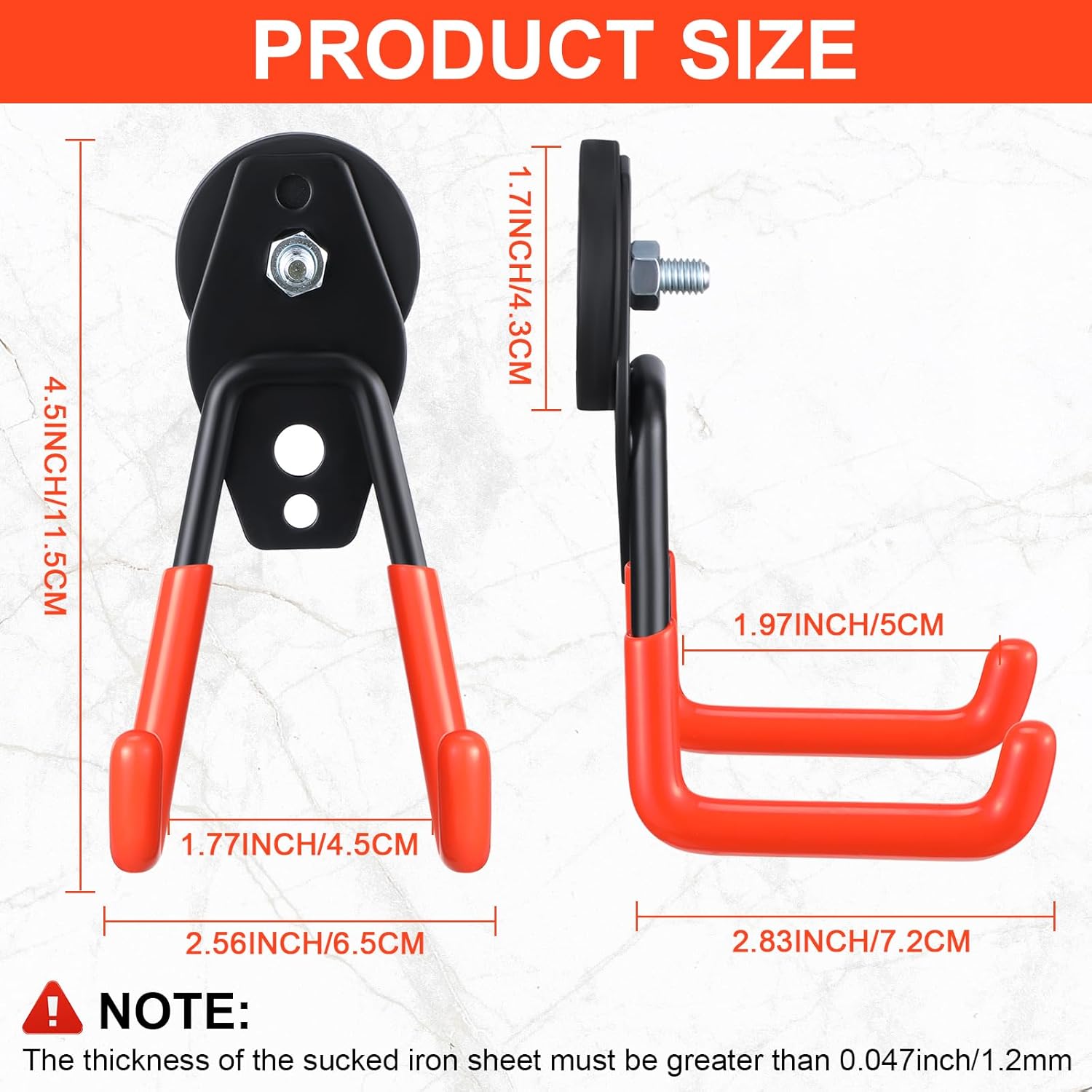 - Easy to Install: no need to use any tools, and the magnetic hooks will not break the surface; The orange magnetic hooks can be placed directly on the metal surface; Please note that the thickness of the sucked iron sheet must be thicker than 0.047 inch/ 1.2 mm; Or else the magnetic hook will slide off